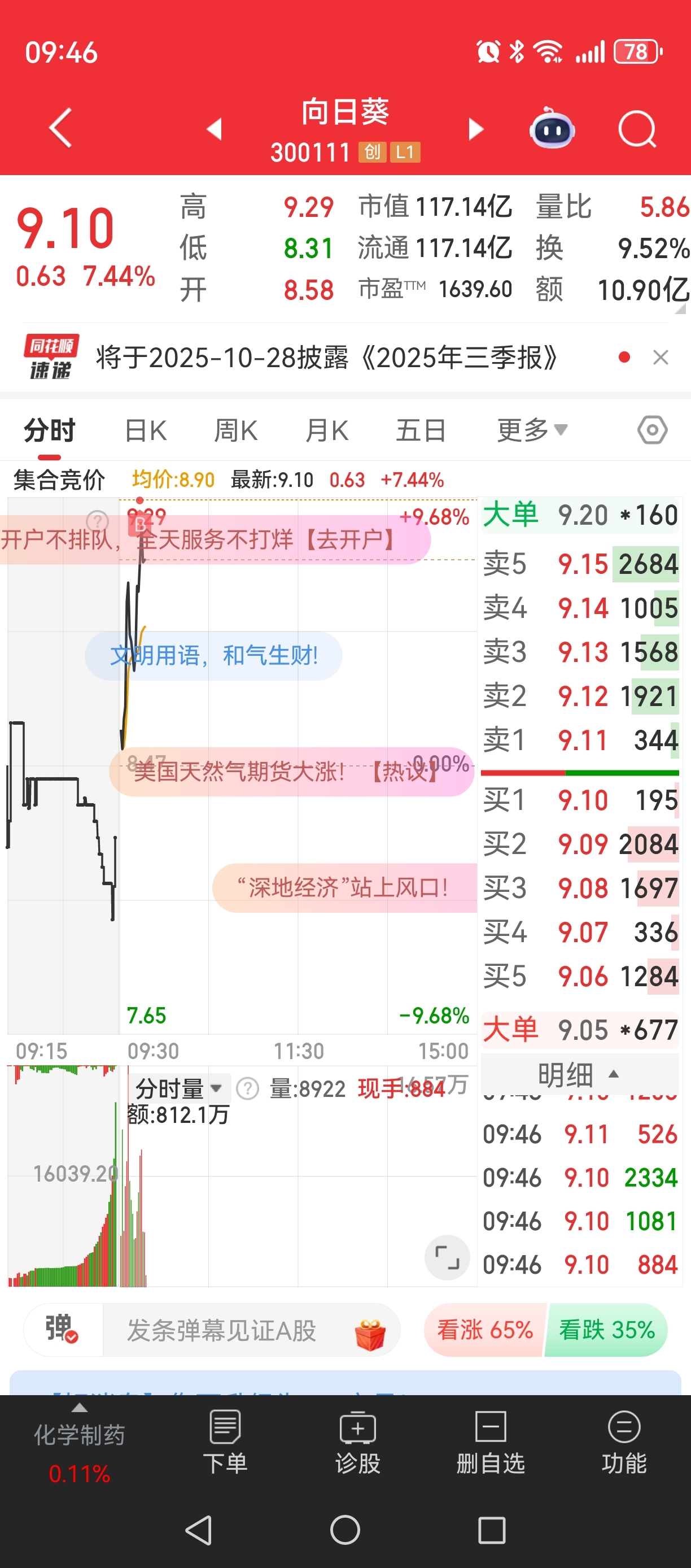 $向日葵(SZ300111)$ 都说明天大涨大跌,主力会听你们的一样,就算主力想涨跌,还有一个大盘限制了,除非总龙头,否则都要看大盘面子,我今天最高价进来的,今天这个收盘价虽然不满意,但是趋势没坏。问题不大。
