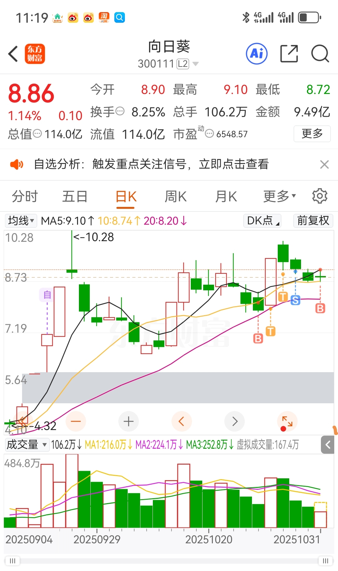 $向日葵(SZ300111)$ 还是那句话不唱空不唱多看好拿稳,不看好就走,不忽悠买不忽悠卖,不劝割肉不劝加仓,不说涨于跌因为我也预判不了,如果我可以预判,你们就不会在股巴见到我废话了,一切资金说了算,股品皆是人品。