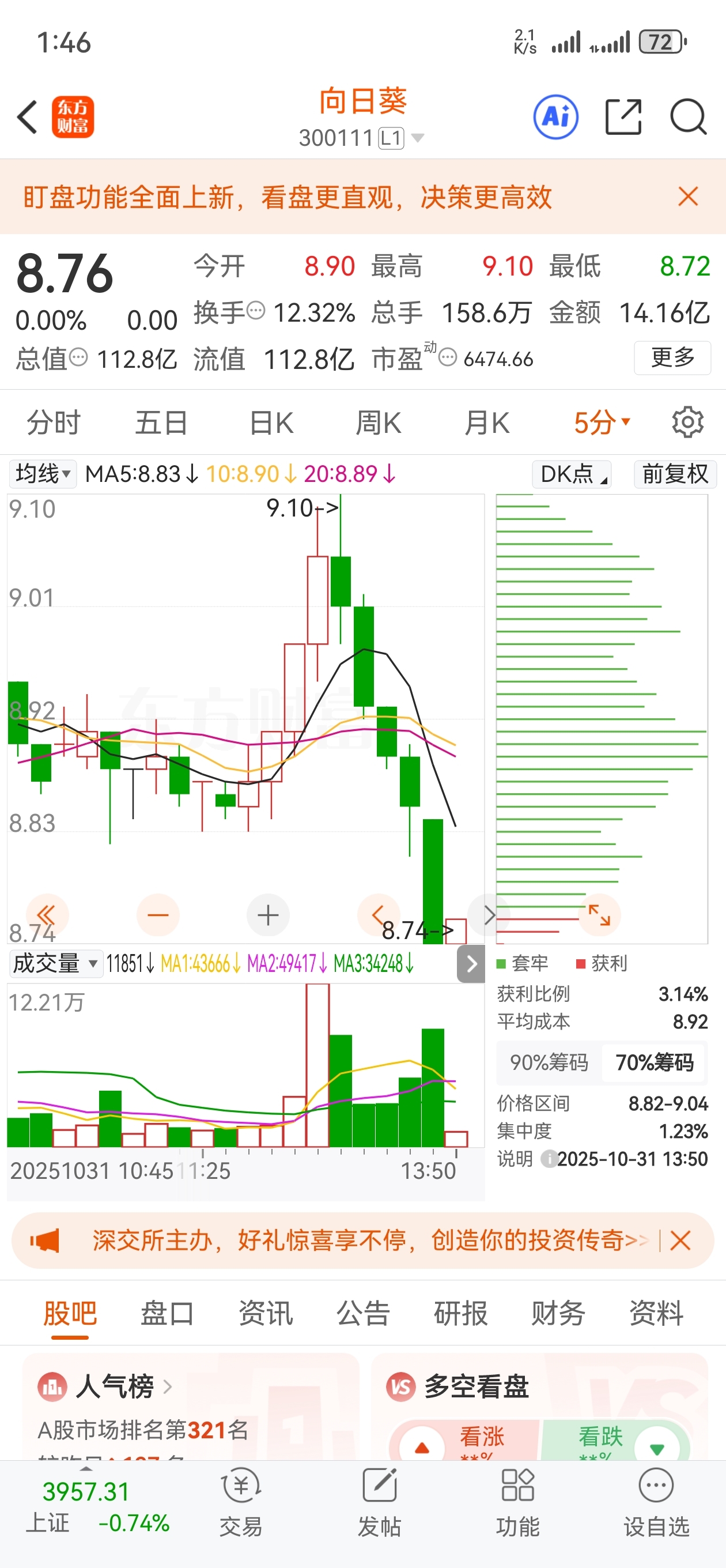 $向日葵(SZ300111)$ 五分钟分时图A杀,放量三柱香