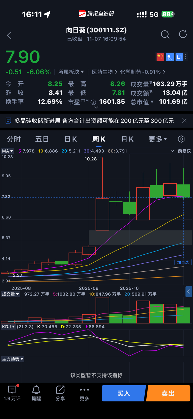 $向日葵(SZ300111)$ 中期看周线。价格就锚定在五周均价八元左右。无论上下蹦哒的多欢。跑远了就会被拽回来。这两天跌了不少也只是回归均值的正常表现而已。不用慌。跌不深,也涨不太高