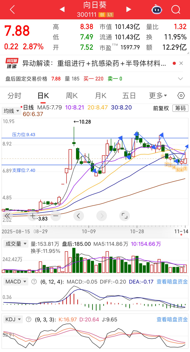 $向日葵(SZ300111)$ 三次上攻未突破压力位,深度回调很正常,三天未跌破7.40确定强支撑,五日线放缓,mac kdj 量能马上金叉,周线向上抬头,月线仍处在上升阶段,马上公布11月份收购最新进展,叠加玄学,下周看涨!反之跌破支撑位卖出!
