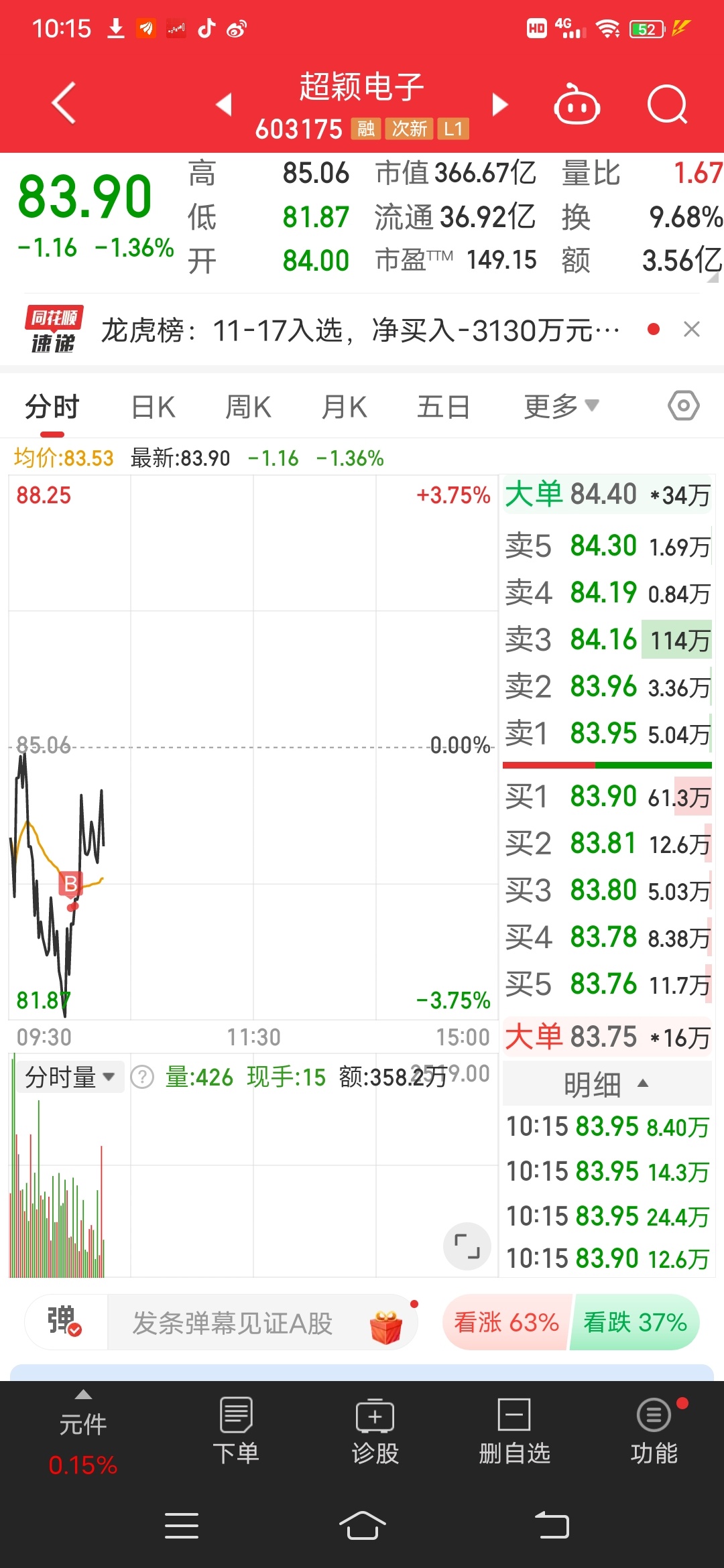 今天运气好好!先是买的超颖电子赚了5个点T出去了,又去买了蓝色光标,蓝色光标现在赚了近8个点