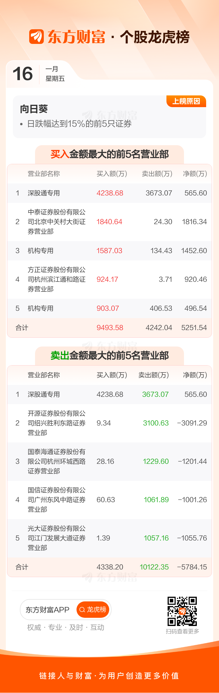 交易所2026年1月16日公布的交易公开信息显示,向日葵因成为日跌幅达到15%的前5只证券上榜。向日葵当日收报4.07元,涨跌幅-17.94%,偏离值-17.94%,换手率19.39%,成交额10.28亿。