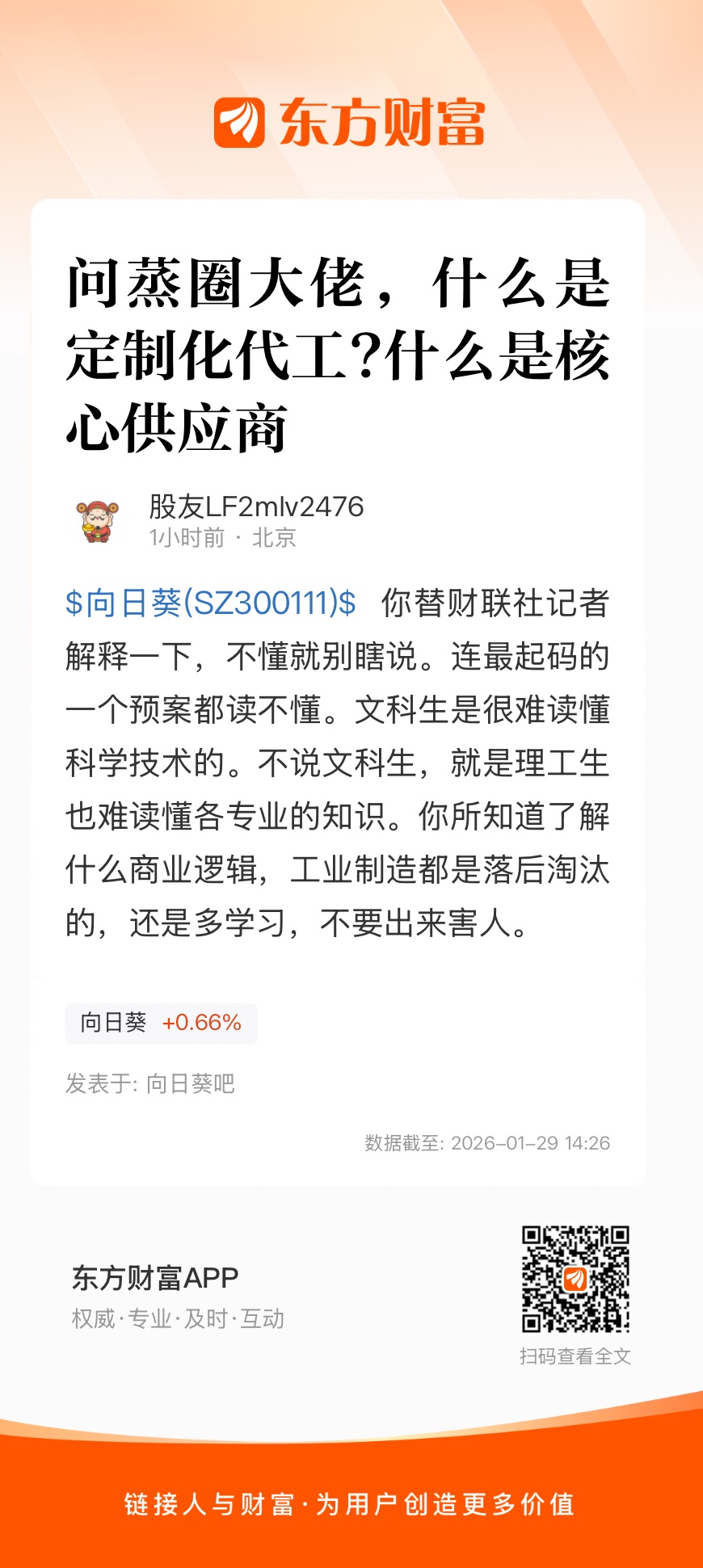 $向日葵(SZ300111)$ 你替财联社记者解释一下,不懂就别瞎说。连最起码的一个预案都读不懂。文科生是很难读懂科学技术的。不说文科生,就是理工生也难读懂各专业的知识。你所知道了解什么商业逻辑,工业制造都是落后淘汰的,还是多学习,不要出来害人。
