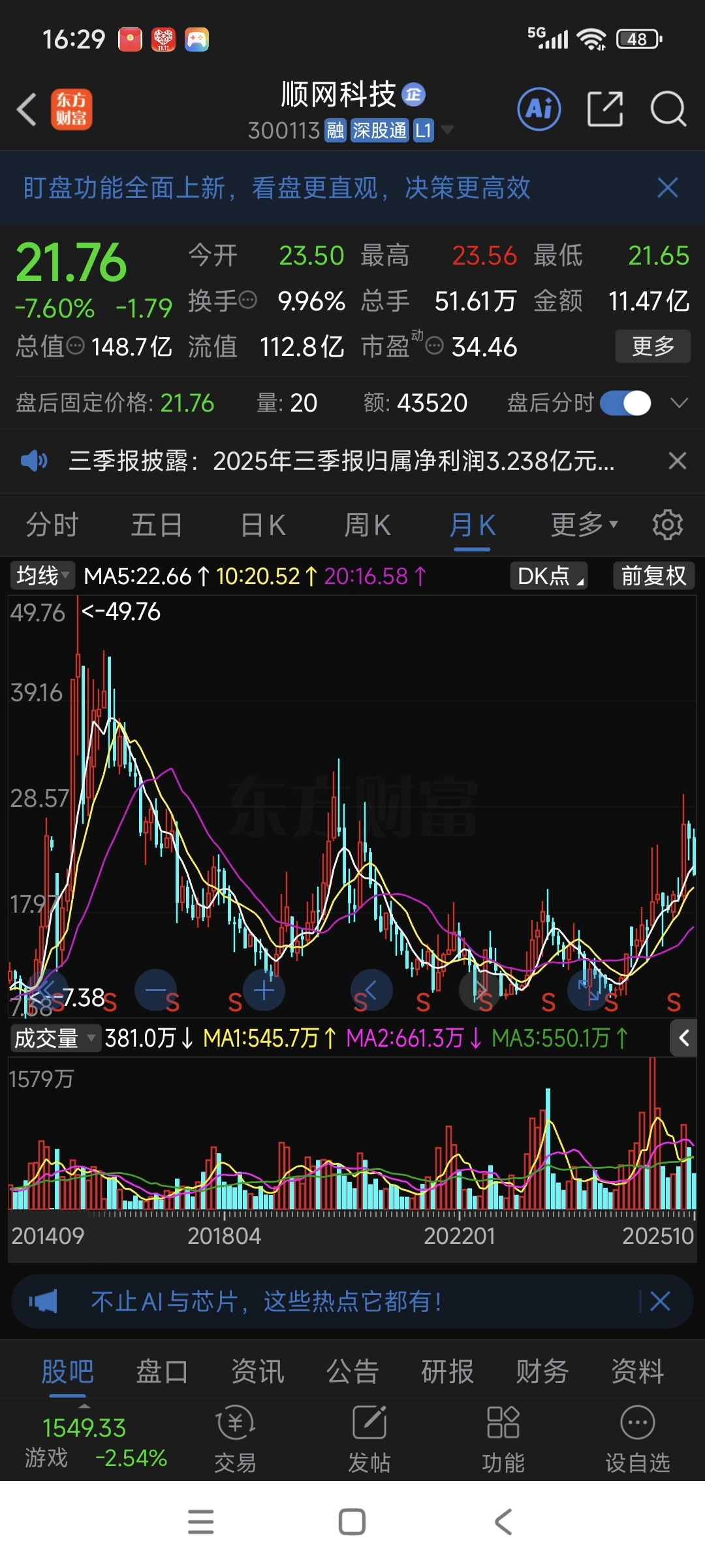 $顺网科技(SZ300113)$ 从月线来看,这个瘟股每涨一波,都要跌十几个月,甚至几十个月,这次才跌2个月!