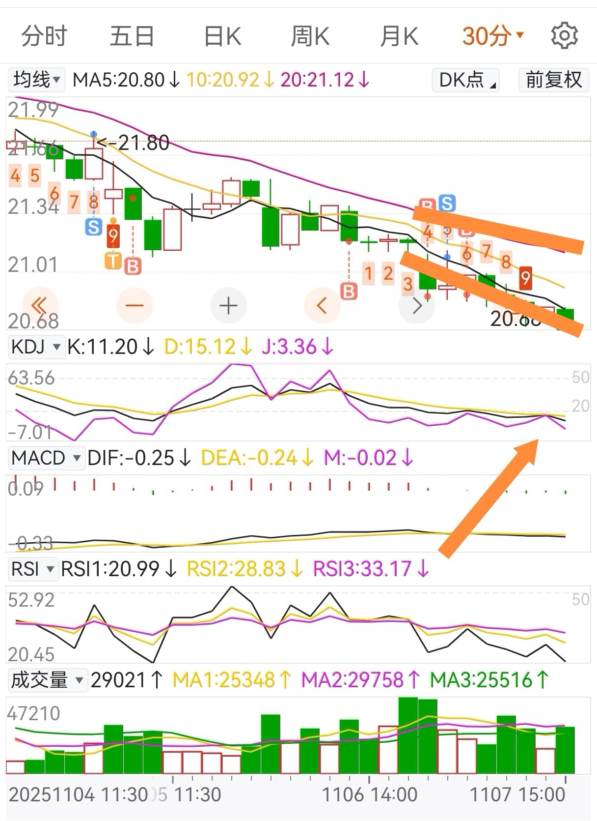 30分钟K线空头发散排列,下午两点KDJ金叉没成功继续探底,RSI<50继续下探,成交量绿多红少且绿柱长。