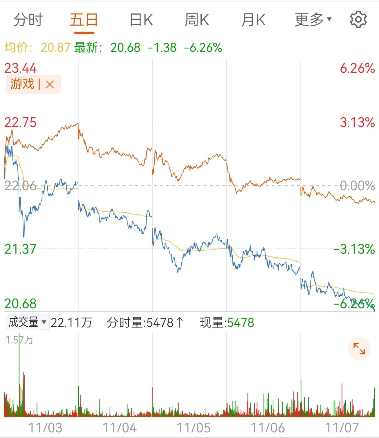 顺网科技5日走势形态与游戏板块高度一致,相对跌幅大6个点,要不是顺网科技市值不大,都以为游戏板块是被顺网科技带崩的了。