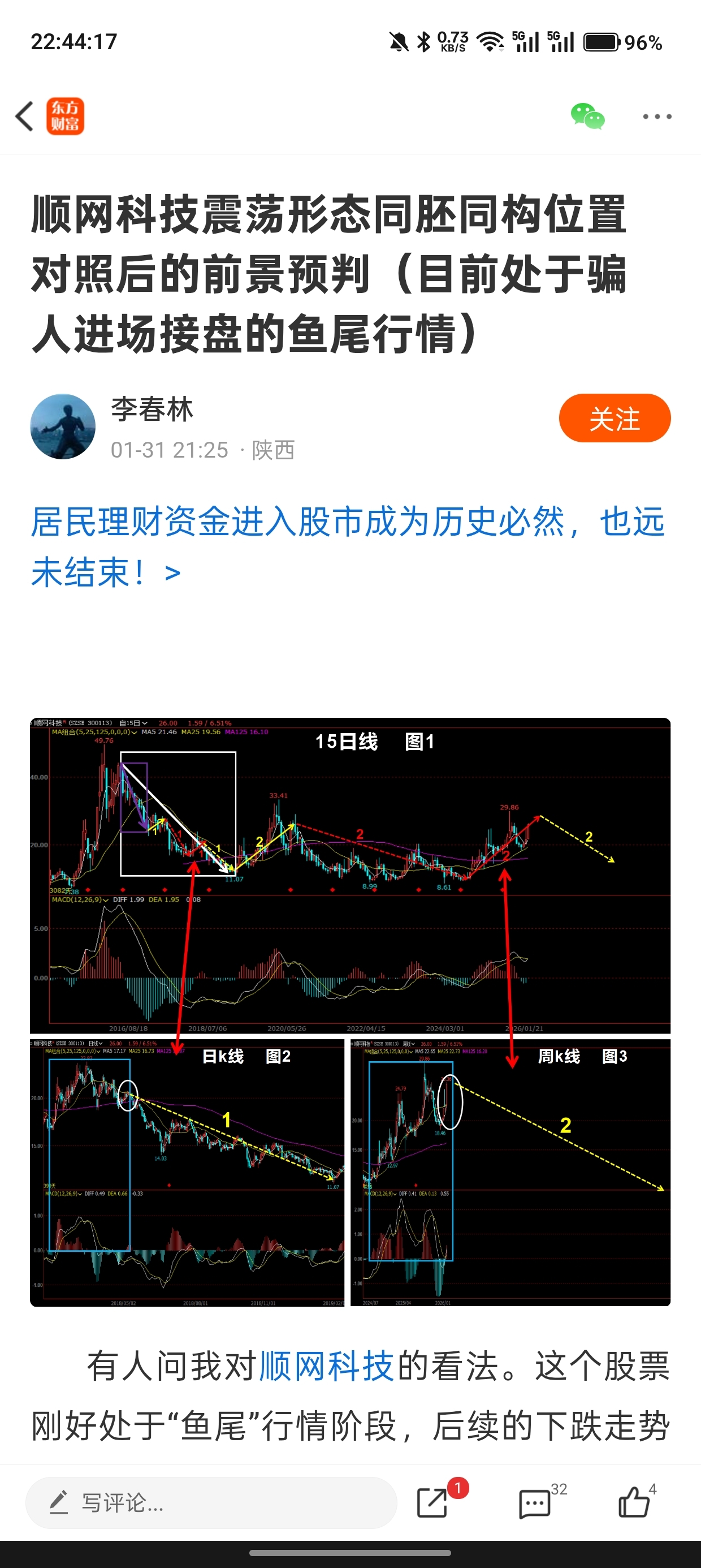 $顺网科技(SZ300113)$ 本来不想发贴的,实在看不下去了,没有任何的技术依据,纯靠yy刻舟求剑,此时此刻的量能,如何能匹配到鱼尾这个词?你可以说周线有压力,但是周线压力位冲击了2次,这是第三次,按照惯性应该去到36-38附近回落下来,断言为鱼尾,为时尚早。你这线画的跟新手小白一样,不看量能,不看区间,不看压力位支撑位,纯在那里YY