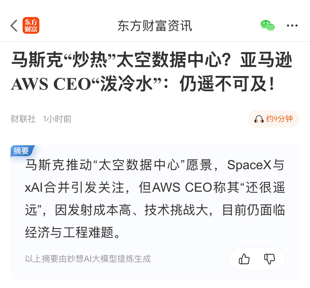 马斯克“炒热”太空数据中心?亚马逊AWS CEO“泼冷水”:仍遥不可及!