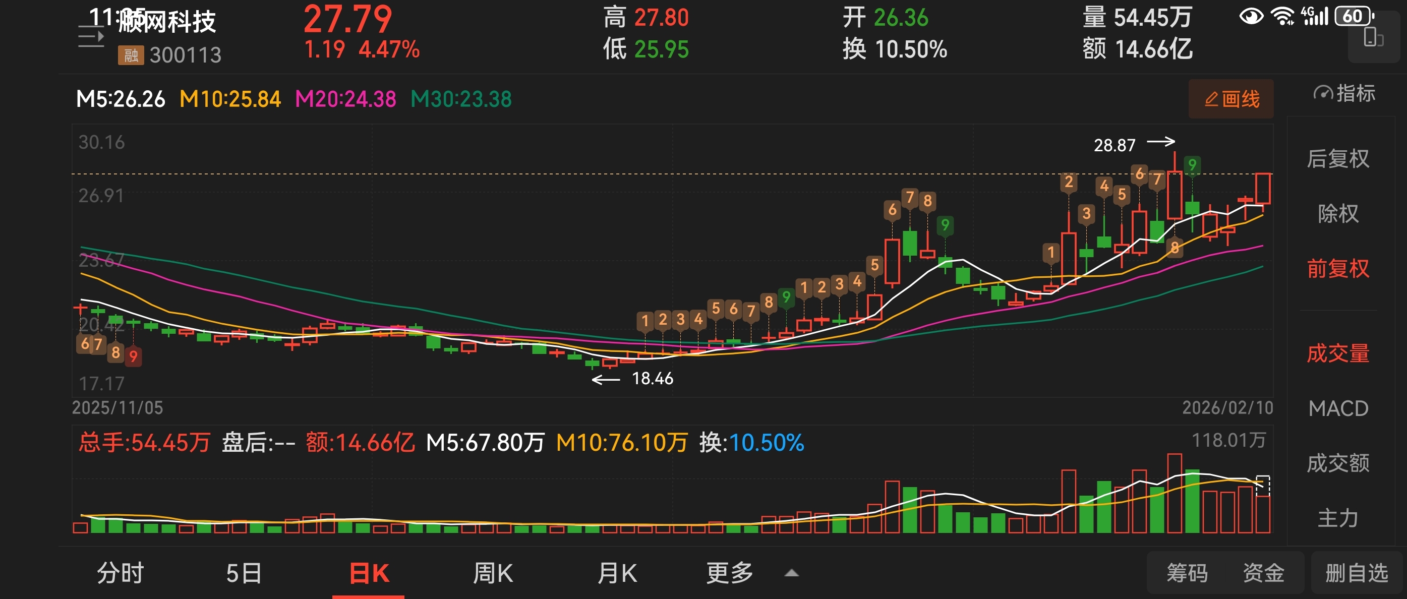 $顺网科技(SZ300113)$ 前天分享的顺网科技,两天涨幅十个点左右,今天看一下过不去二八压力位位置,可以先短线止盈