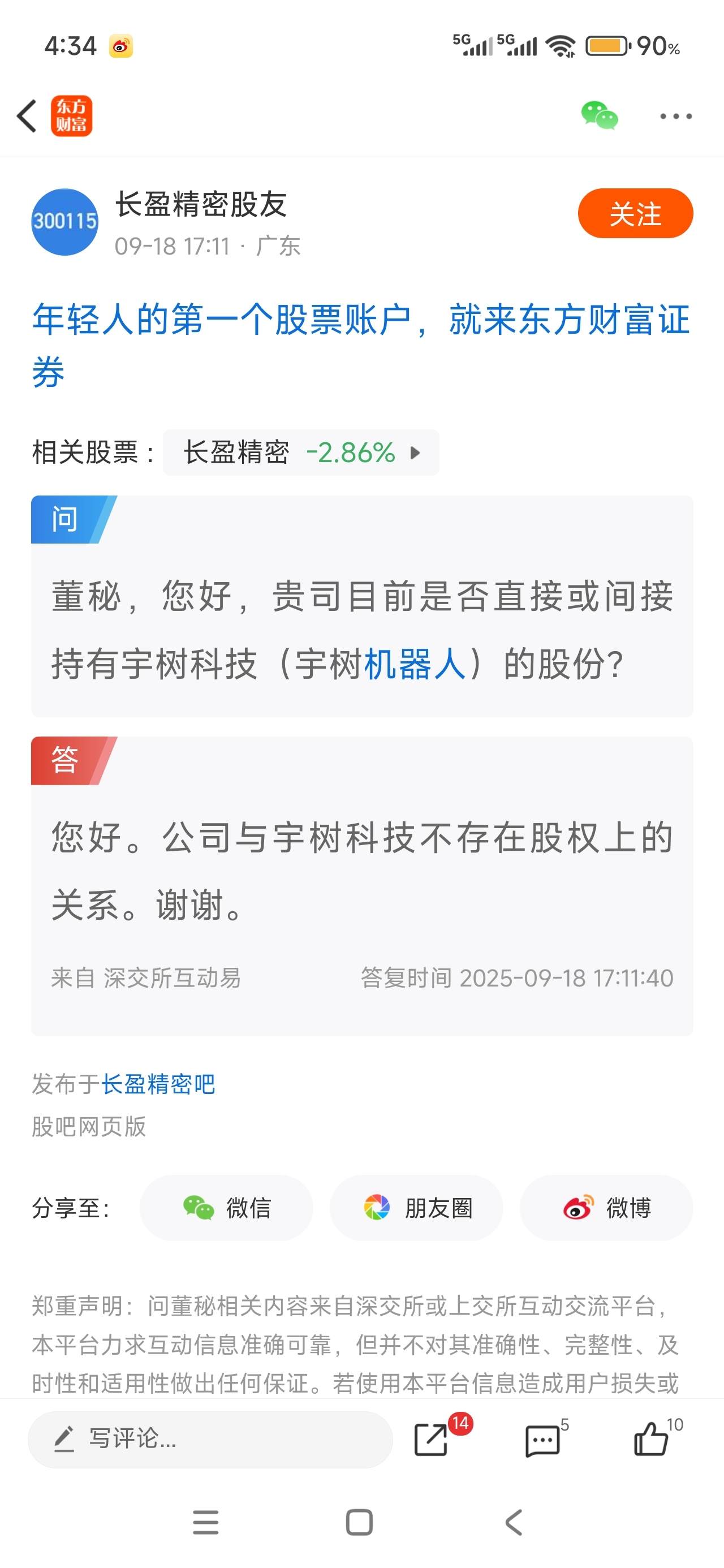 $长盈精密(SZ300115)$ 骗子门,就不要发宇树科技股权了。他真没有