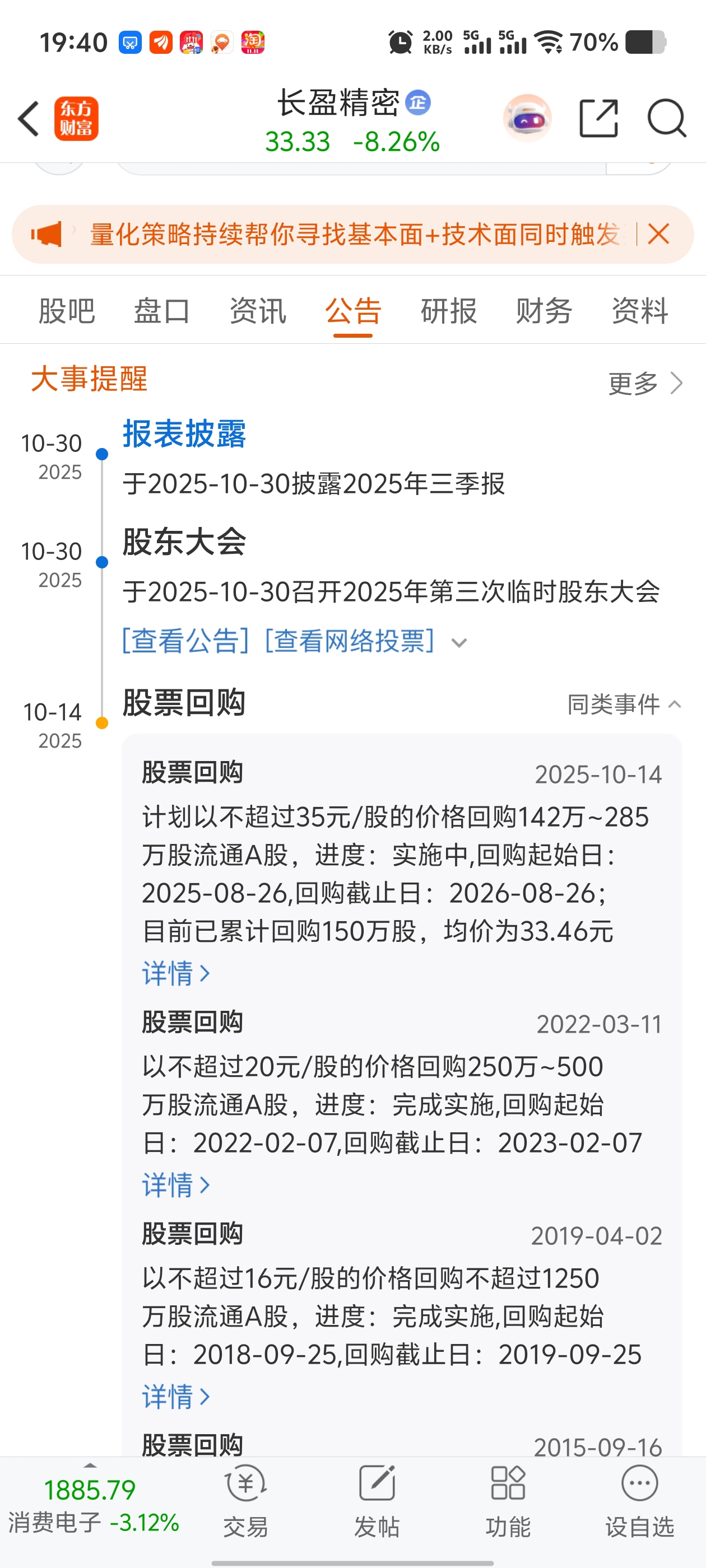 $长盈精密(SZ300115)$ 己回购了,150万股