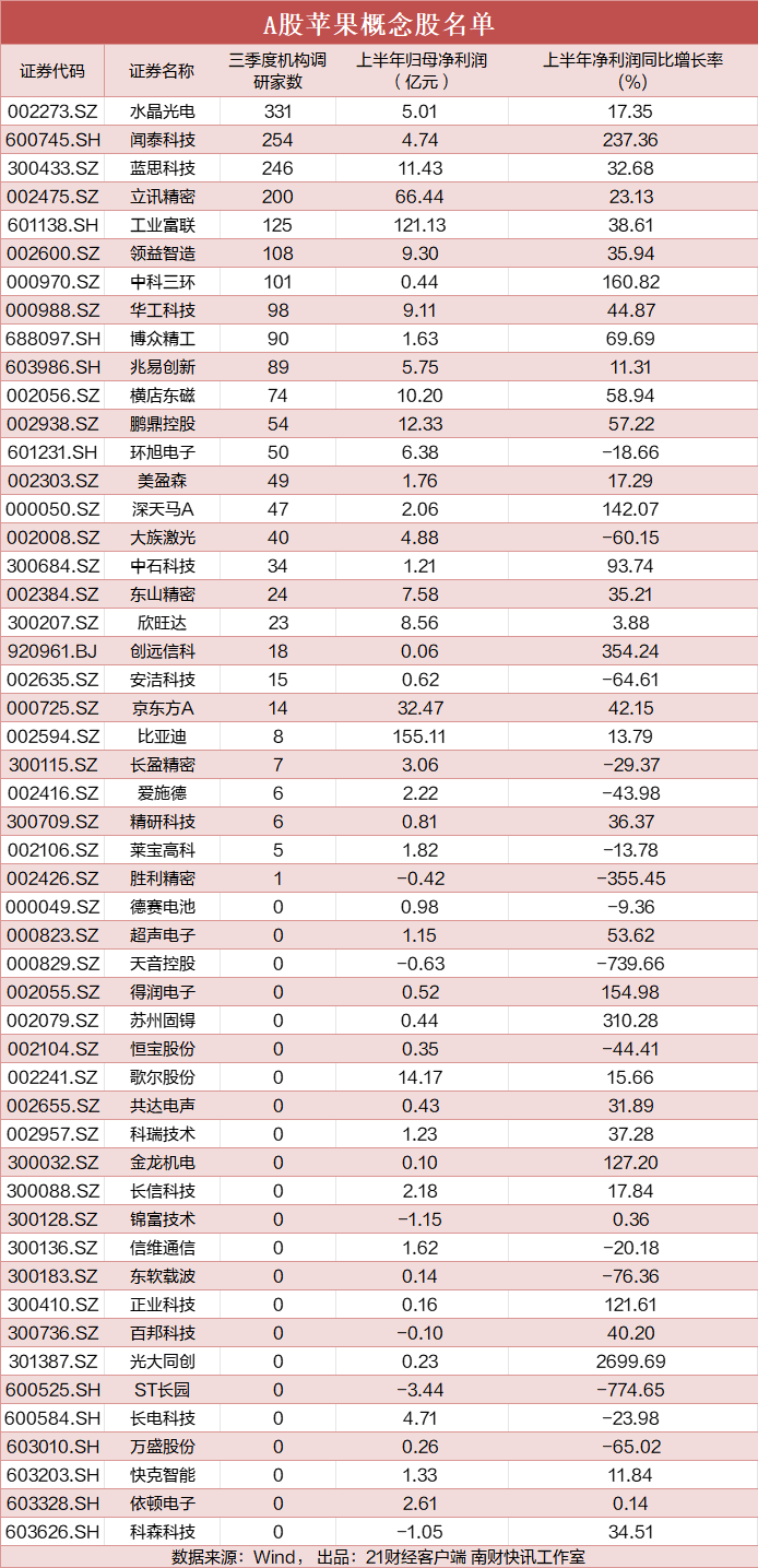 结合今年中报数据与三季度机构调研信息,多家苹果概念股呈现业绩向好态势。其中,工业富联(601138.SH)、立讯精密、蓝思科技(300433.SZ)等多家企业三季度获机构调研家数靠前,上半年净利润增长亮眼。