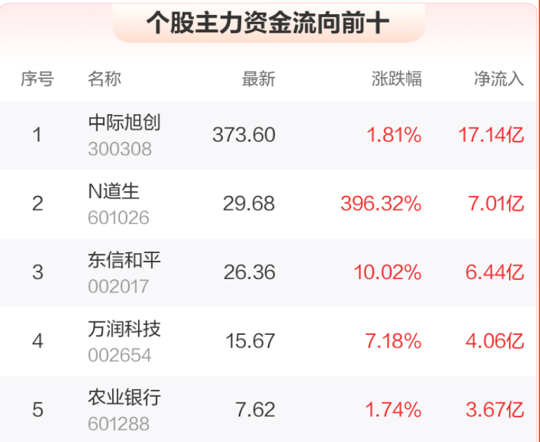 主力净买入,中际旭创排名A股第一,净买入17.14亿元。N道生排名第二