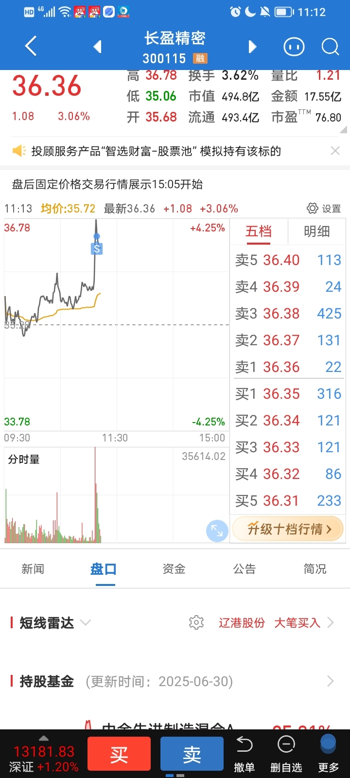 $长盈精密(SZ300115)$ 已卖祝你们好运,有可能我被洗,就看主力怎么想了