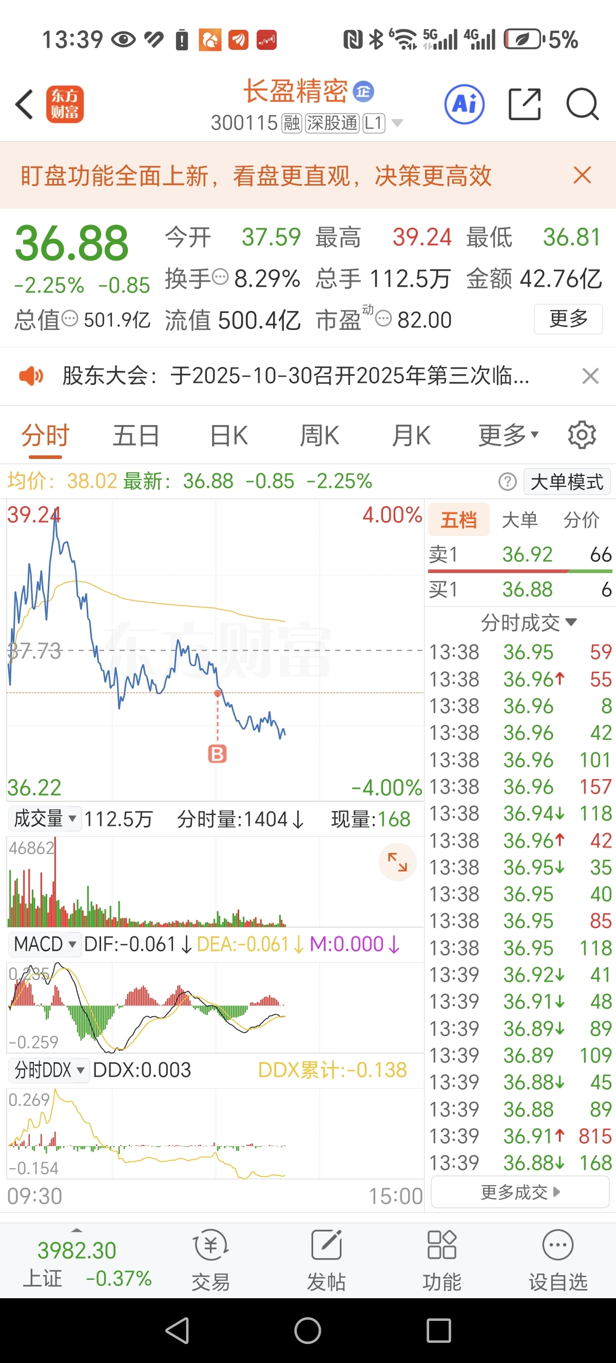 $长盈精密(SZ300115)$ 昨天37卖飞后,郁闷的很,今天明明跌下来知道不是买点还是硬上。