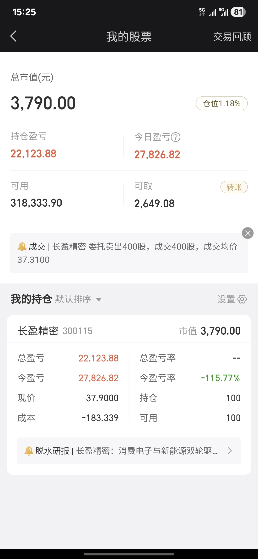 $长盈精密(SZ300115)$ 昨天最高位买的 感谢主力 留下发财