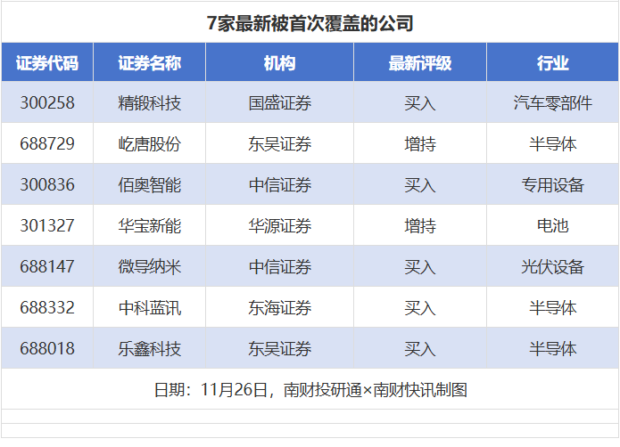 首次覆盖方面,11月26日券商共给出了7次首次覆盖,其中精锻科技获得国盛证券给予“买入”评级,屹唐股份获得东吴证券给予“增持”评级,佰奥智能、微导纳米获得中信证券给予“买入”评级,华宝新能获得华源证券给予“增持”评级。