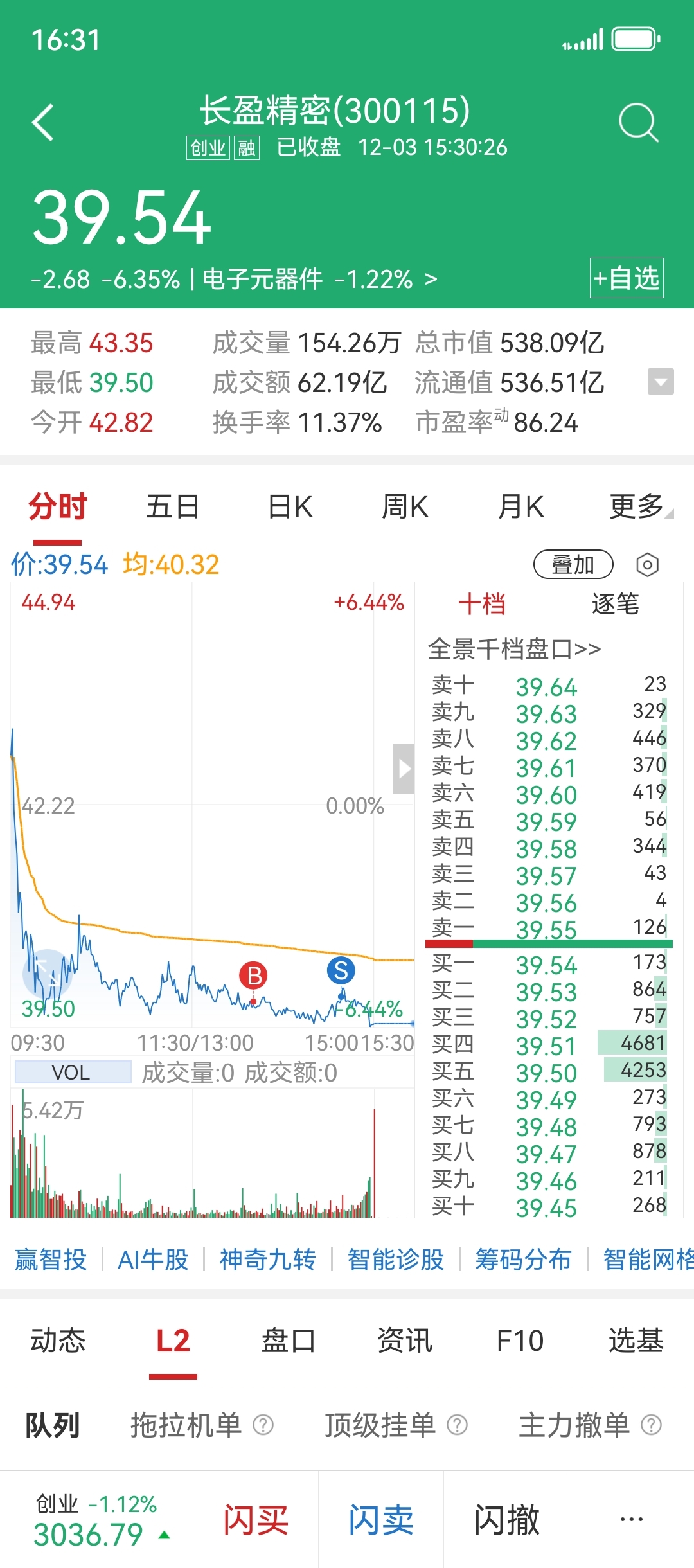 $长盈精密(SZ300115)$ 下午39.70元加仓,都没给两个点的空间来T,尾盘微利40元T出来了。不然又得套住没商量。