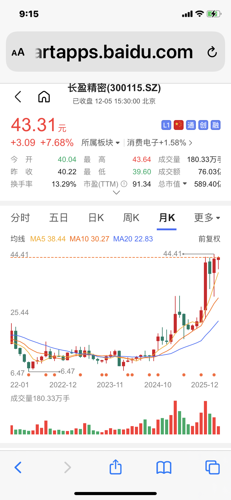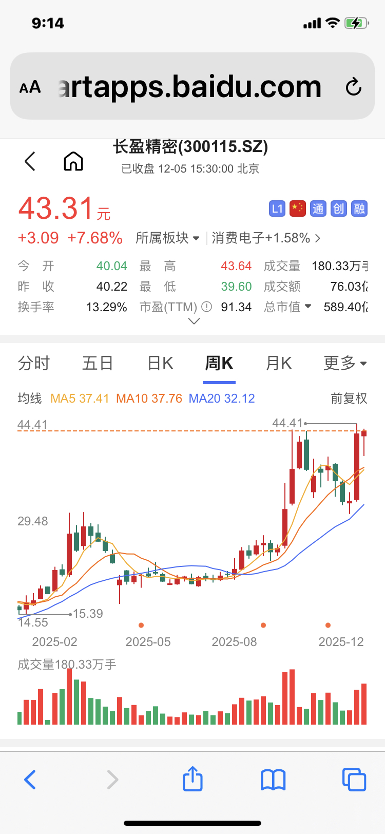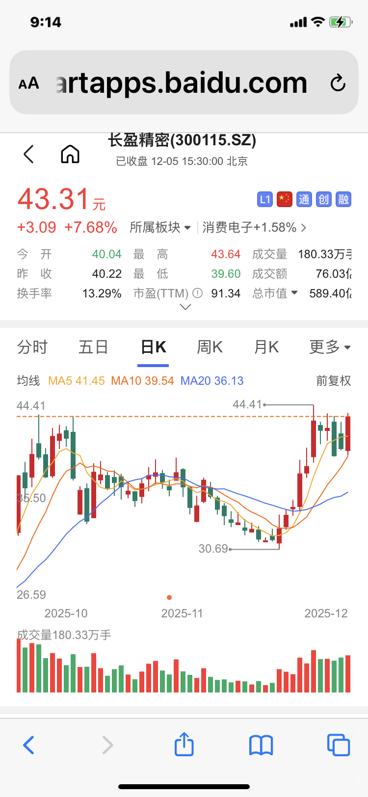 300115长盈精密当下(20251205)票价43.31,似乎到了“可咸可甜”的非常时刻:从技术层面上来看11.28之44.41能否成功突破尤为关键!