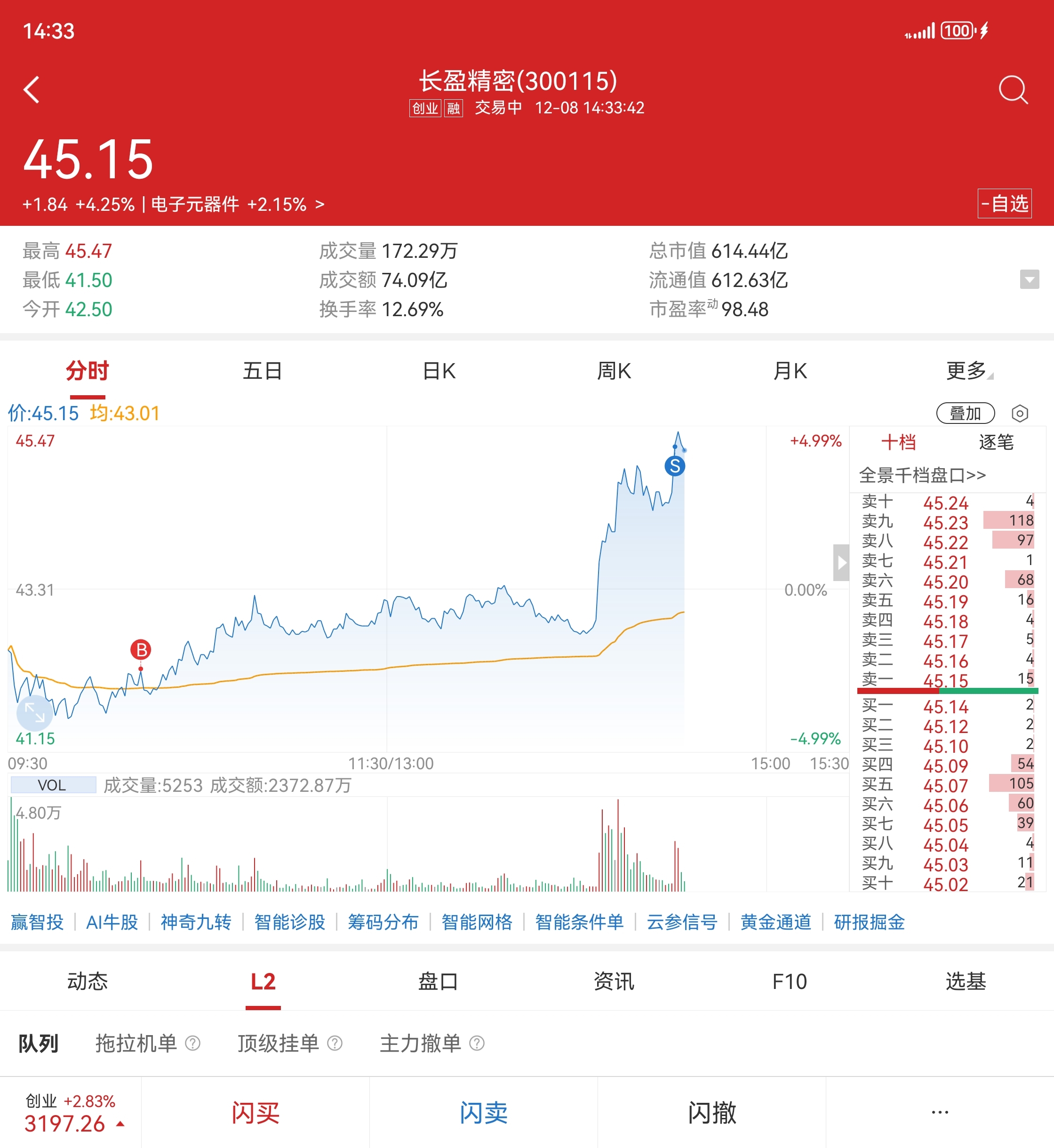 $长盈精密(SZ300115)$ 基本T在高位。底仓不动。!