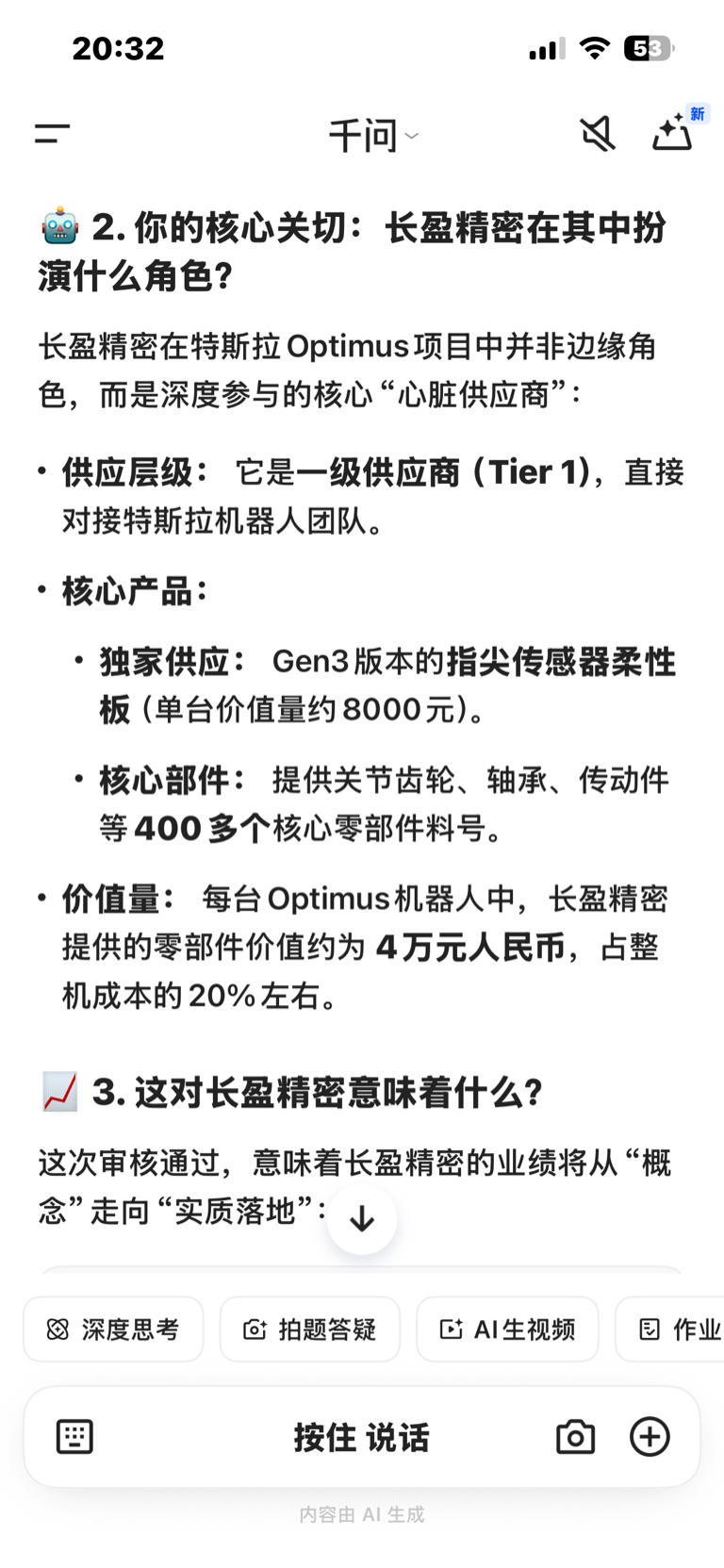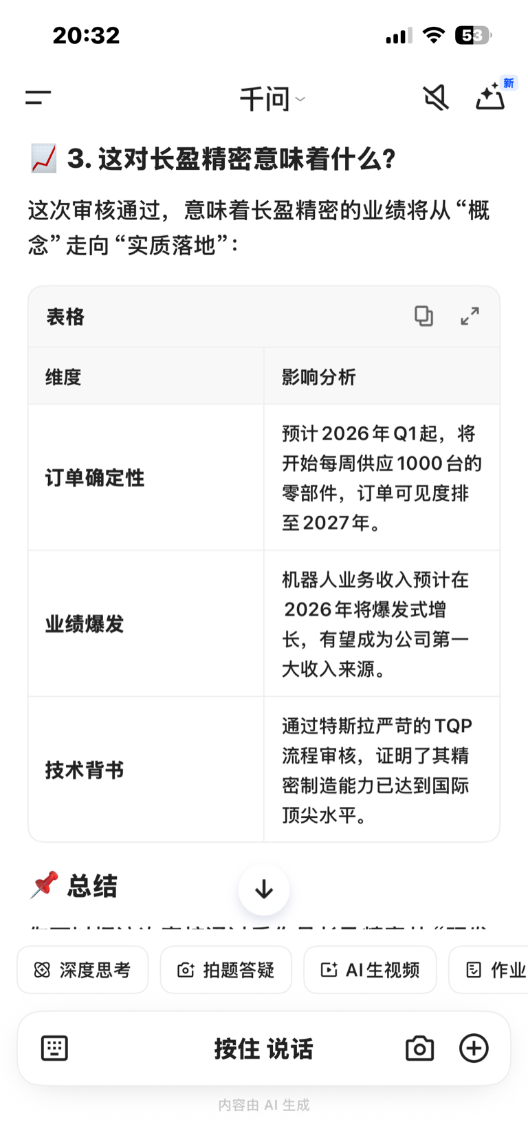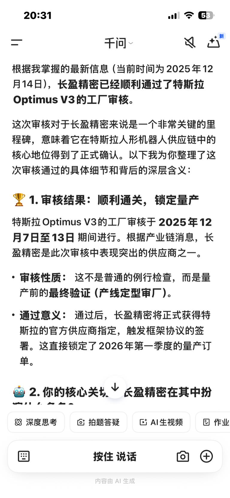 $长盈精密(SZ300115)$ 特斯拉核心供应商长盈精密V3工厂已经正式通过,源源不断的订单将在26年Q1中体现出来。