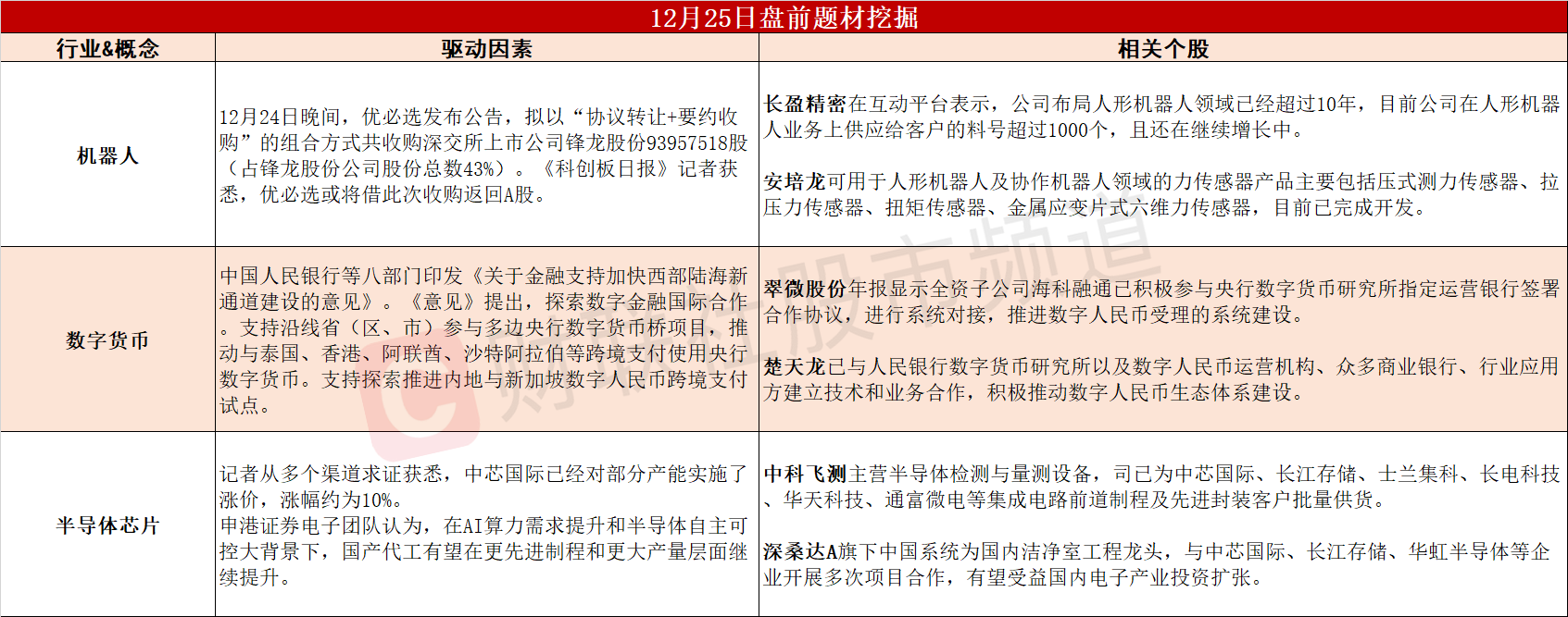 ①优必选拟16.65亿元入主锋龙股份,机器人产业链迎全新强催化。②八部门推进多边央行数字货币桥项目,数字货币应用有望迎重大进展。③中芯国际部分产能涨价10%,国内半导体产业链迎黄金上升期。