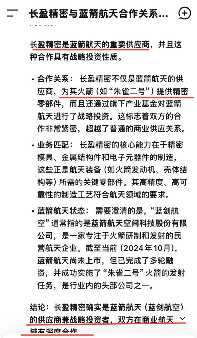 友说,长盈精密是蓝剑航天的精密件供应商兼战略投资者!上网一查,果然!蓝剑航天成功