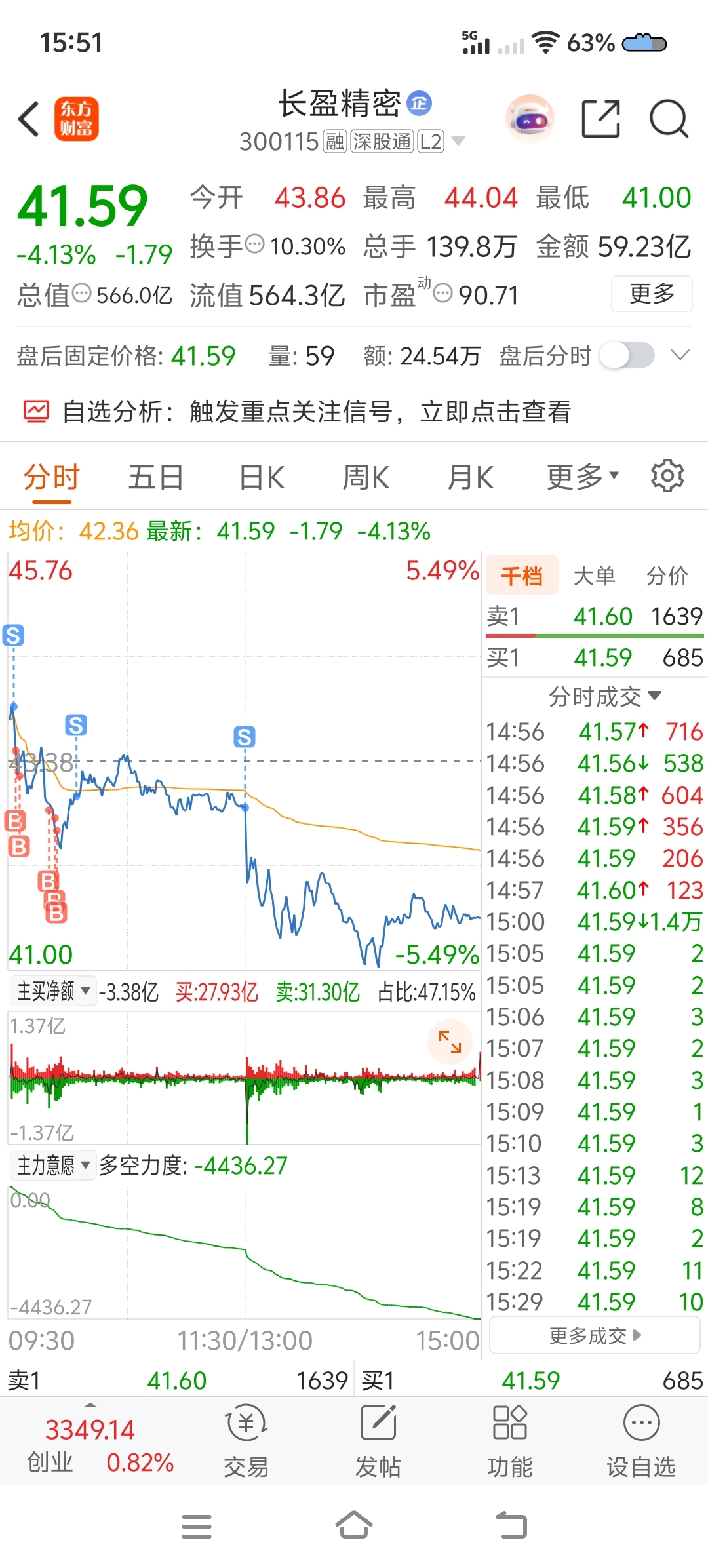 $长盈精密(SZ300115)$ 今天T了个寂寞!开盘第一笔冲高卖出半仓,后分批买回 买急了。剩下半仓分两笔卖出就没胆再买回去了,庆幸早盘收盘前临时起意全部卖出能出的部分。这个融资盘砸盘太狠了。