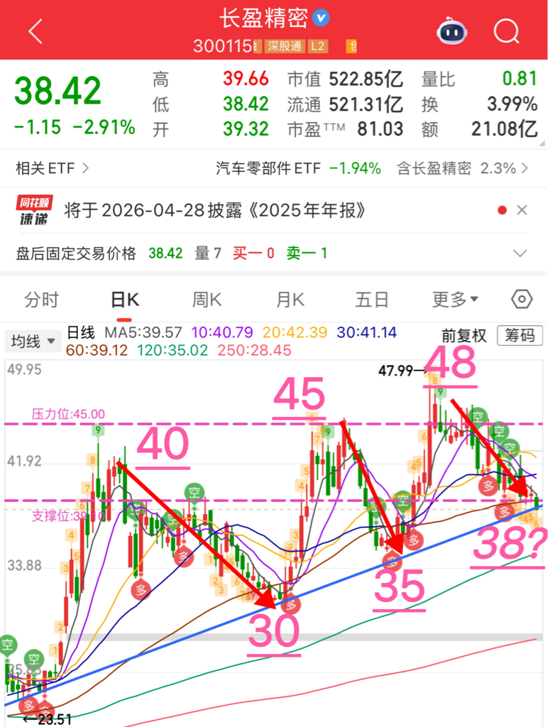 $长盈精密(SZ300115)$ 每次高点大概回调10块,然后拉升差不多15,这次回调到38也差不多了。
