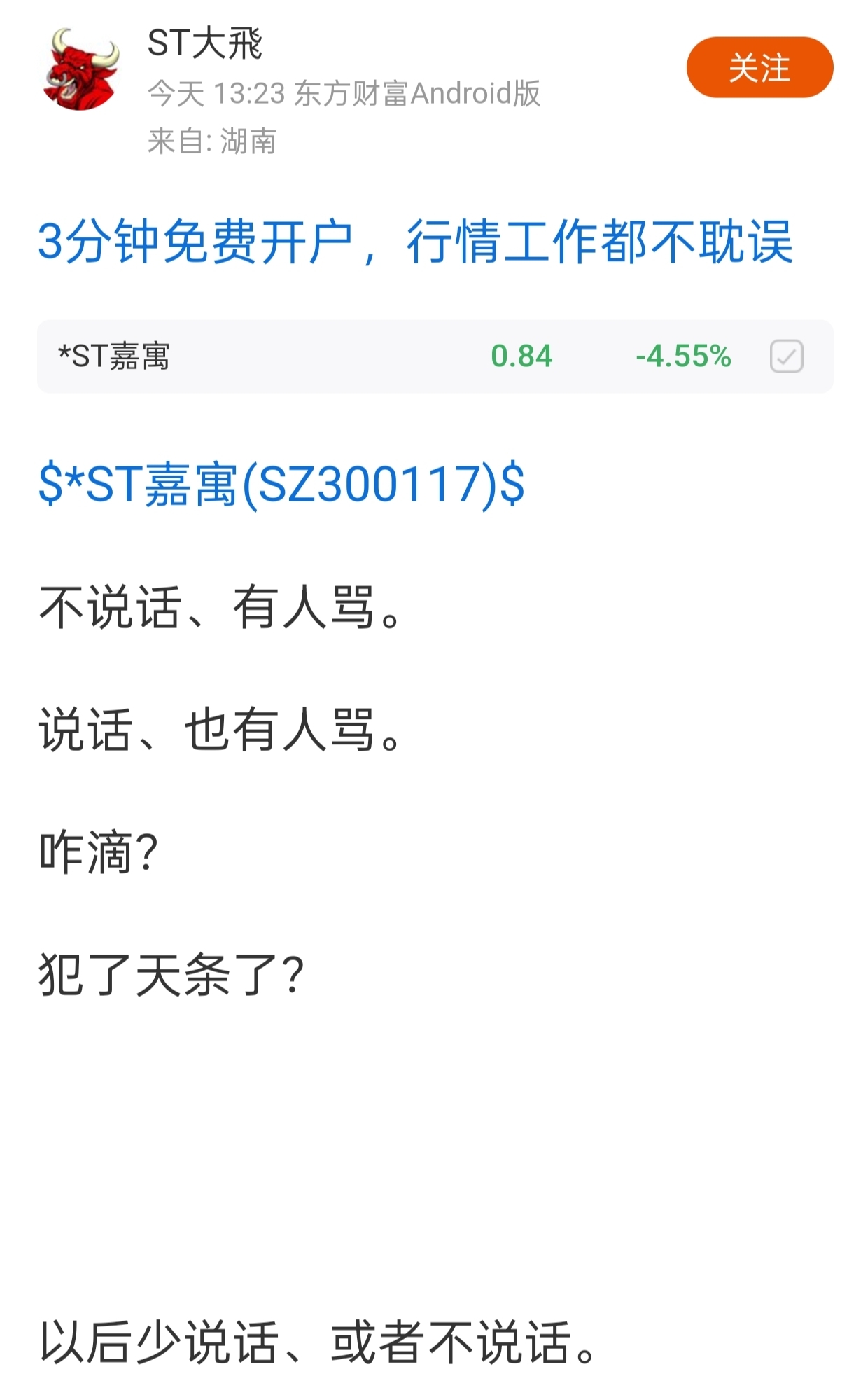 $*ST嘉寓(SZ300117)$ 怎么评价这种人,忽悠了这么多人来接盘,绝大多数都是他的粉丝,现在他的铁粉都大幅度亏损,他在这装可怜。反倒是一直提醒风险的人,被他称为空空。我们就作为一个正常的人,一只股票从2块多一路跌倒8毛,我想请问看空有什么问题。跌了这么多还看好,还拉人接盘这种事也就大飞这种精神分裂才能干出来