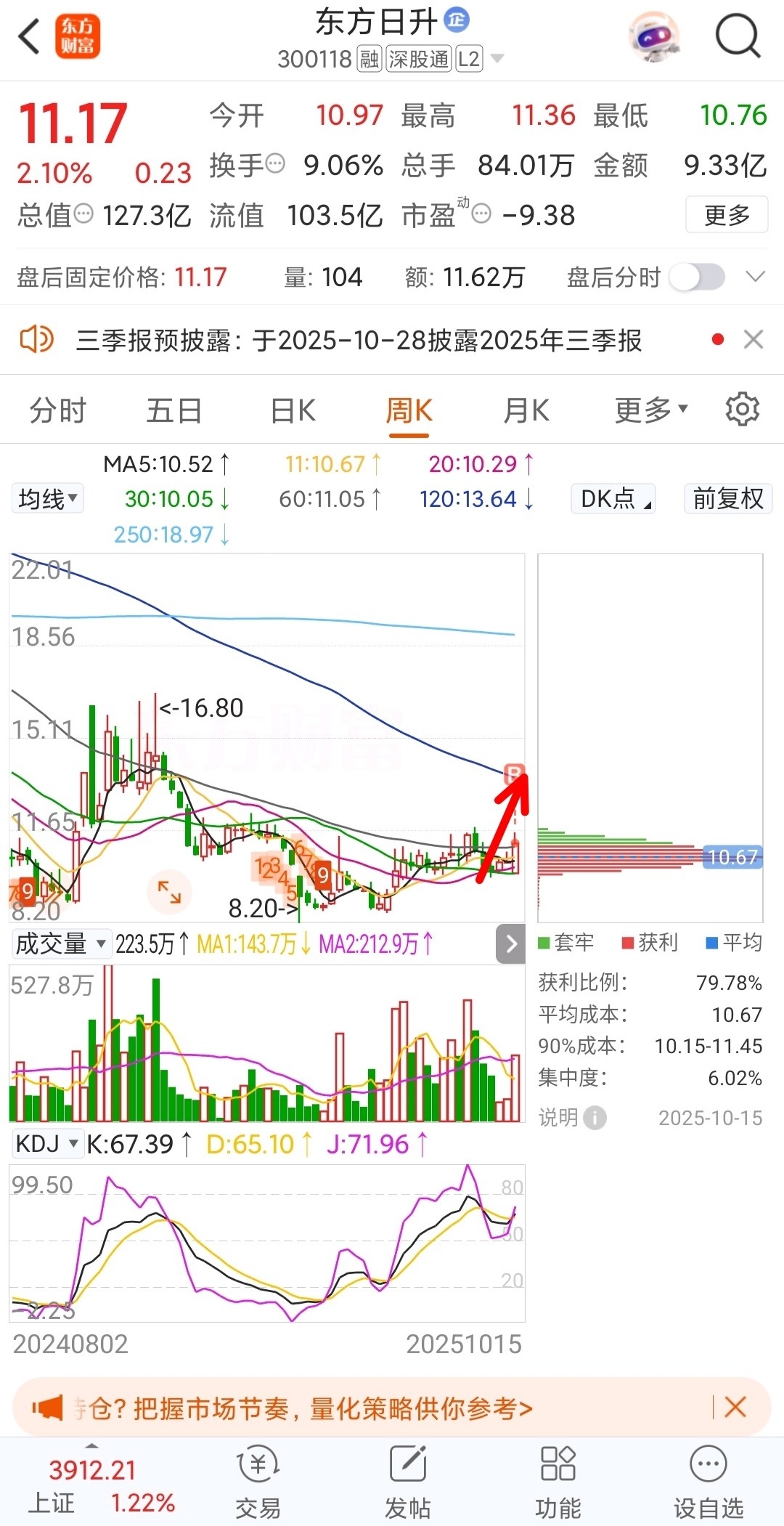 $东方日升(SZ300118)$ 周线必到13.64,日线刚放量拐头向上