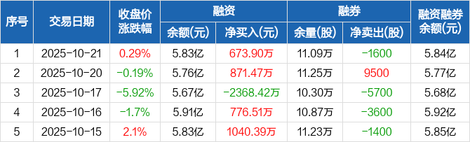 融资方面,当日融资买入3512.1万元,融资偿还2838.2万元,融资净买入673.9万元。融券方面,融券卖出0股,融券偿还1600股,融券余量11.09万股,融券余额114.67万元。融资融券余额合计5.84亿元。