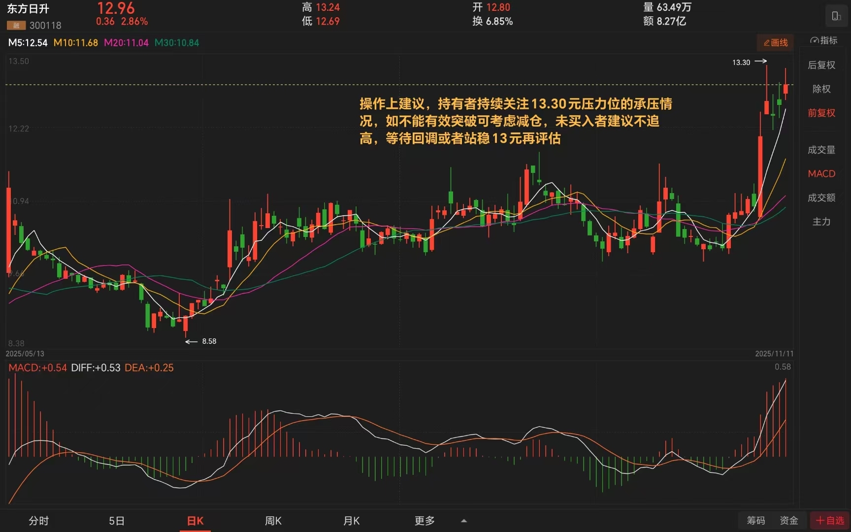 $东方日升(SZ300118)$ 当前均线系统与MACD指标皆向好,资金流入较好,但是近期K线与成交量一般,向上动力稍显不足,操作上建议,持有者持续关注13.30元压力位的承压情况,如不能有效突破可考虑减仓,未买入者建议不追高,等待回调或者站稳13元再评估。