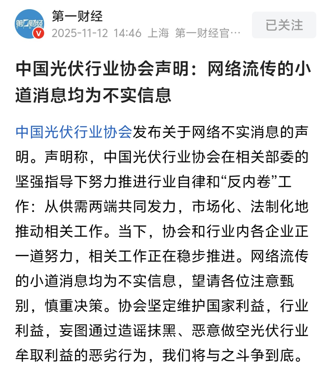 $东方日升(SZ300118)$ 新能源板块内部出现极端分化:光伏(PV)- 崩盘单向下杀,不带回头,这明显就是机构单方行为,证明机构有了明显的获利了结动机,小作文只是导火索不要随便抄底刚破位资金流出。光伏板块遭遇重挫 ,尤其是协鑫科技大幅下跌 。市场传闻多家硅片企业降价 ,导致所谓的光伏“反内卷”联盟被证伪 ,被嘲讽为“就是个笑话” 。
