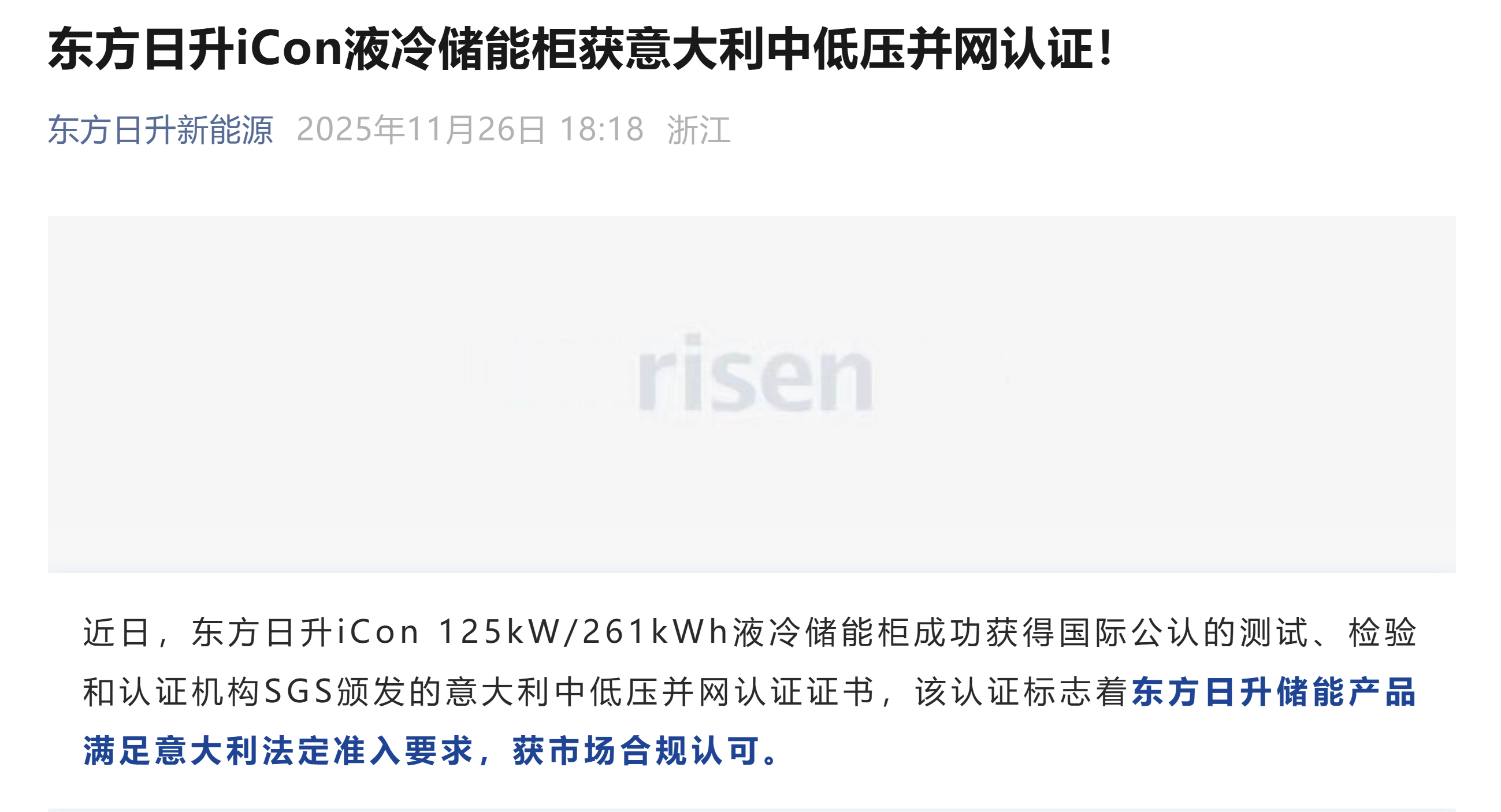 东方日升iCon液冷储能柜获意大利中低压并网认证! 是微信公众号的,不是小道消息