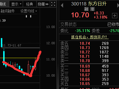 东方日升黄线(庄家成本线),自救回血,回血结束,卖出了结。