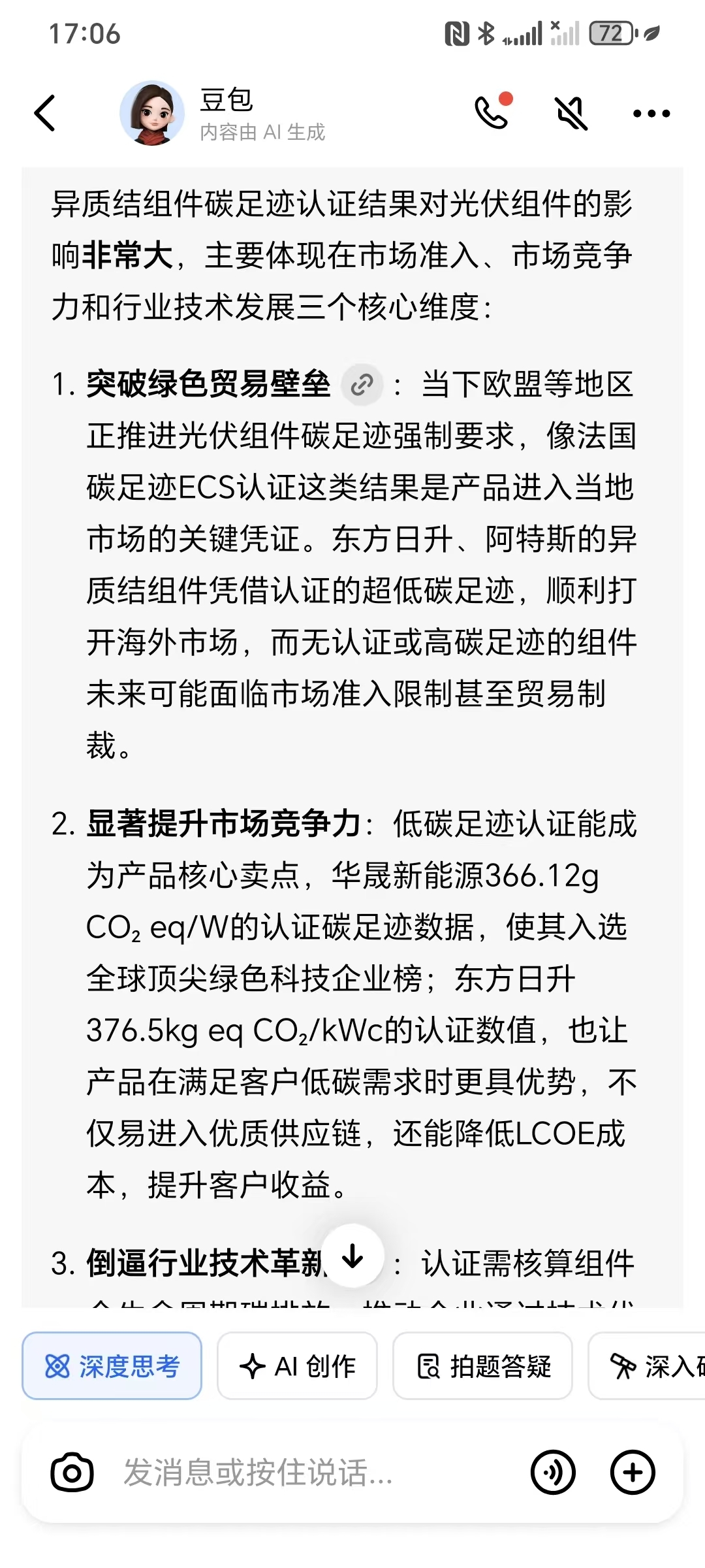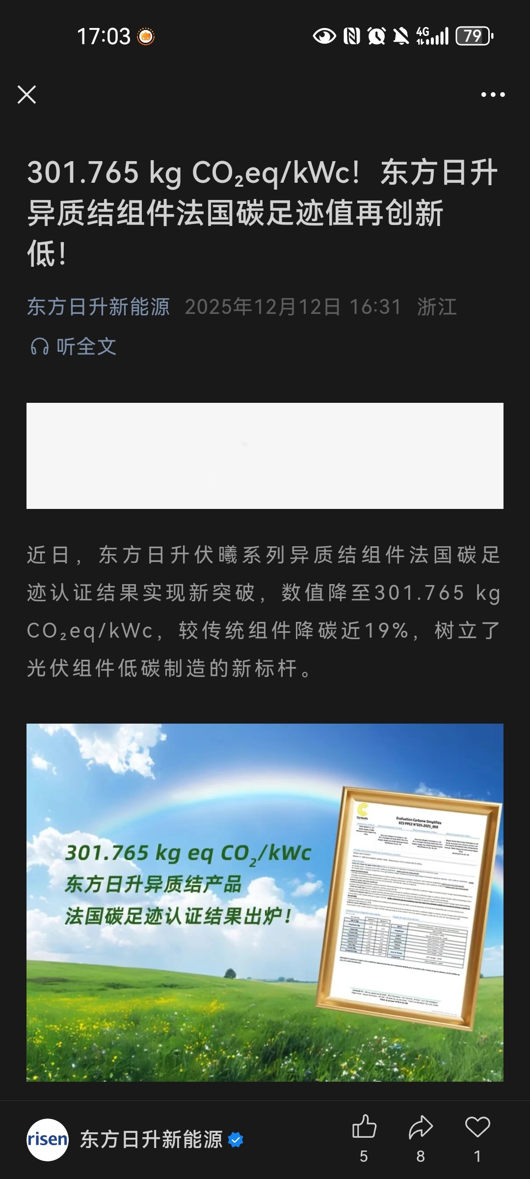 这个可以有,虽然光伏烂大街了,但这货看起来技术储备和更新还是领先市场的,有助于海外市场的开拓,并且中央经济工作会议也定调了明年以双碳引领,所以明年光伏储能这些还是有机会的,市场要求高对日升这种有技术储备的公司是好事,能淘汰很多技术能力不强的,以日升这个碳足迹认证结果在国内绝对是金字塔顶的。