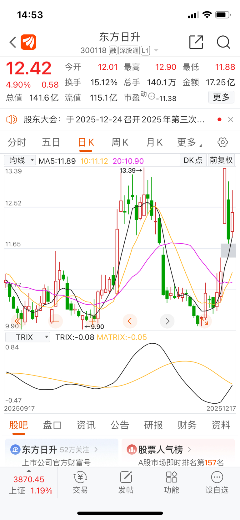 $东方日升(SZ300118)$ 又要去补11.5的缺口,太拉了!量化一直割