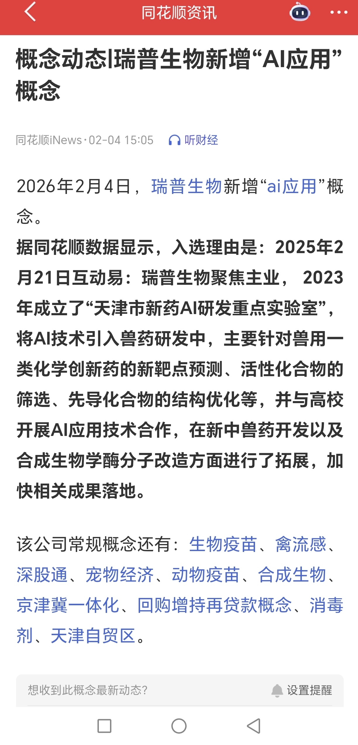 同花顺新增的瑞普生物“AI应用”概念,就是没有归属何种AI应用…才不涨吗?唉!