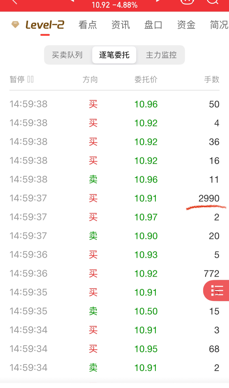 $经纬辉开(SZ300120)$ 尾盘确实看到了有资金动作,但不晓得是真买还是想竞价再出一些货,毕竟对倒拉不用花米,尾盘这个大单买入就有猫腻,想买为什么挂10.92,挂10.93,或者10.94才有机会买的进去,有诱多嫌疑,里面的兄弟们是走是留自行斟酌!
