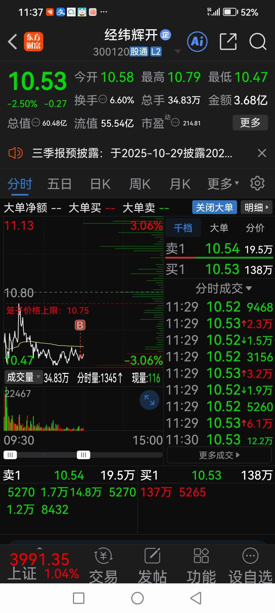 $经纬辉开(SZ300120)$ 今天10.52继续买回来,周五11元卖了