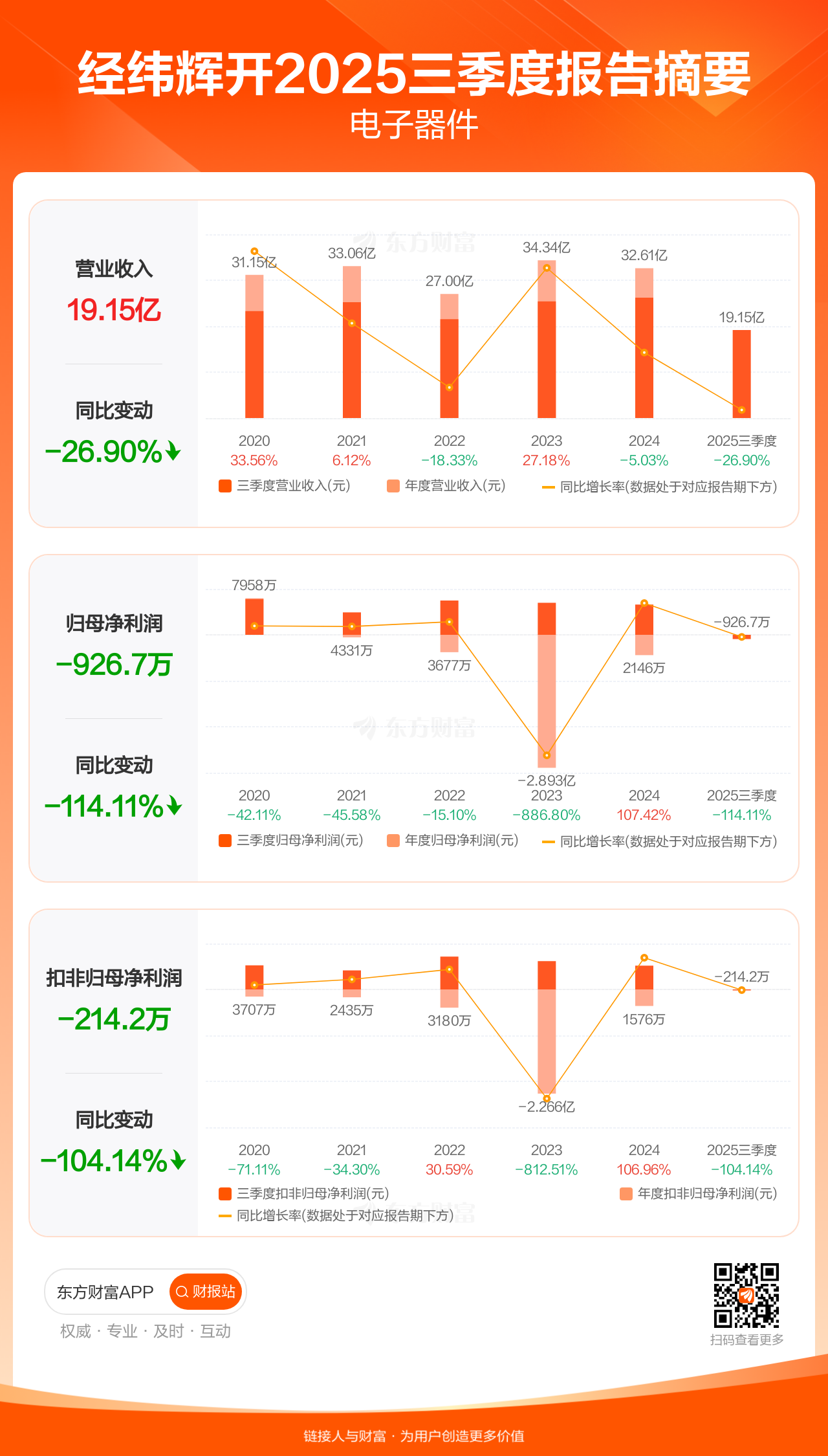 经纬辉开10月29日发布2025年三季报显示,公司前三季实现营业收入19.15亿元,同比下滑26.90%;归母净利润-926.70万元;扣非归母净利润-214.18万元。