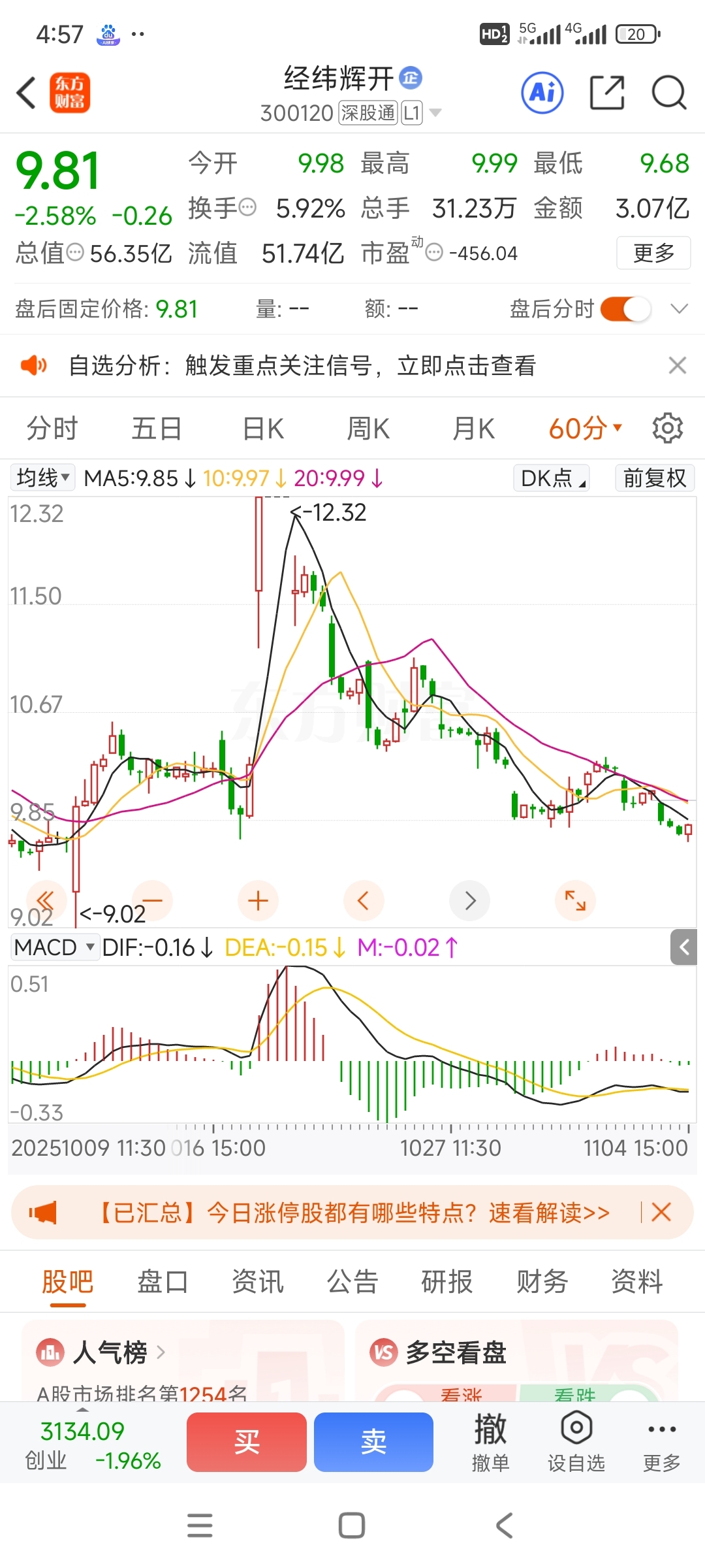 $经纬辉开(SZ300120)$ 60分钟己经底背离了,我看好反弹