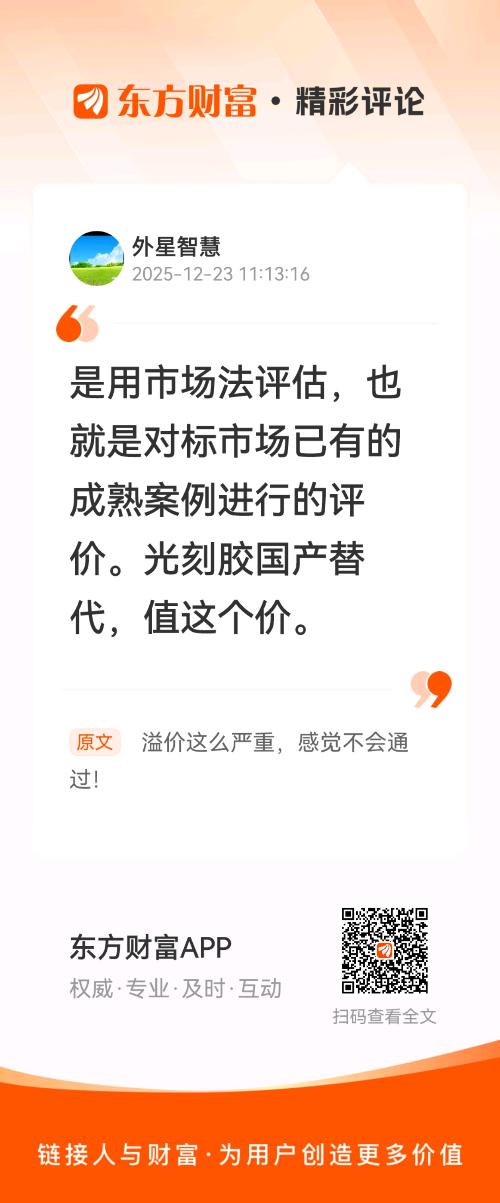 //@外星智慧 :是用市场法评估,也就是对标市场已有的成熟案例进行的评价。光刻胶国产替代,值这个价。