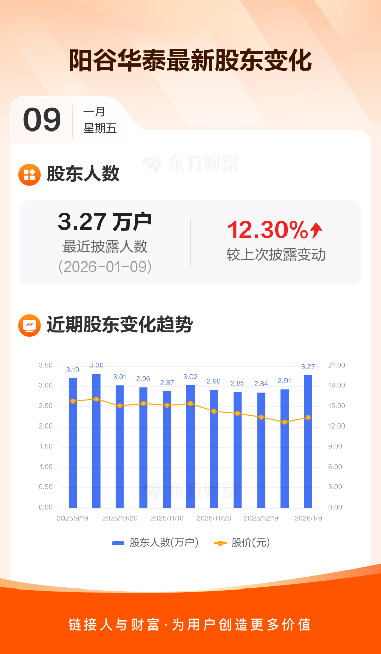 阳谷华泰:截至1月9日最新股东户数3.27万户,较上期增加12.30%