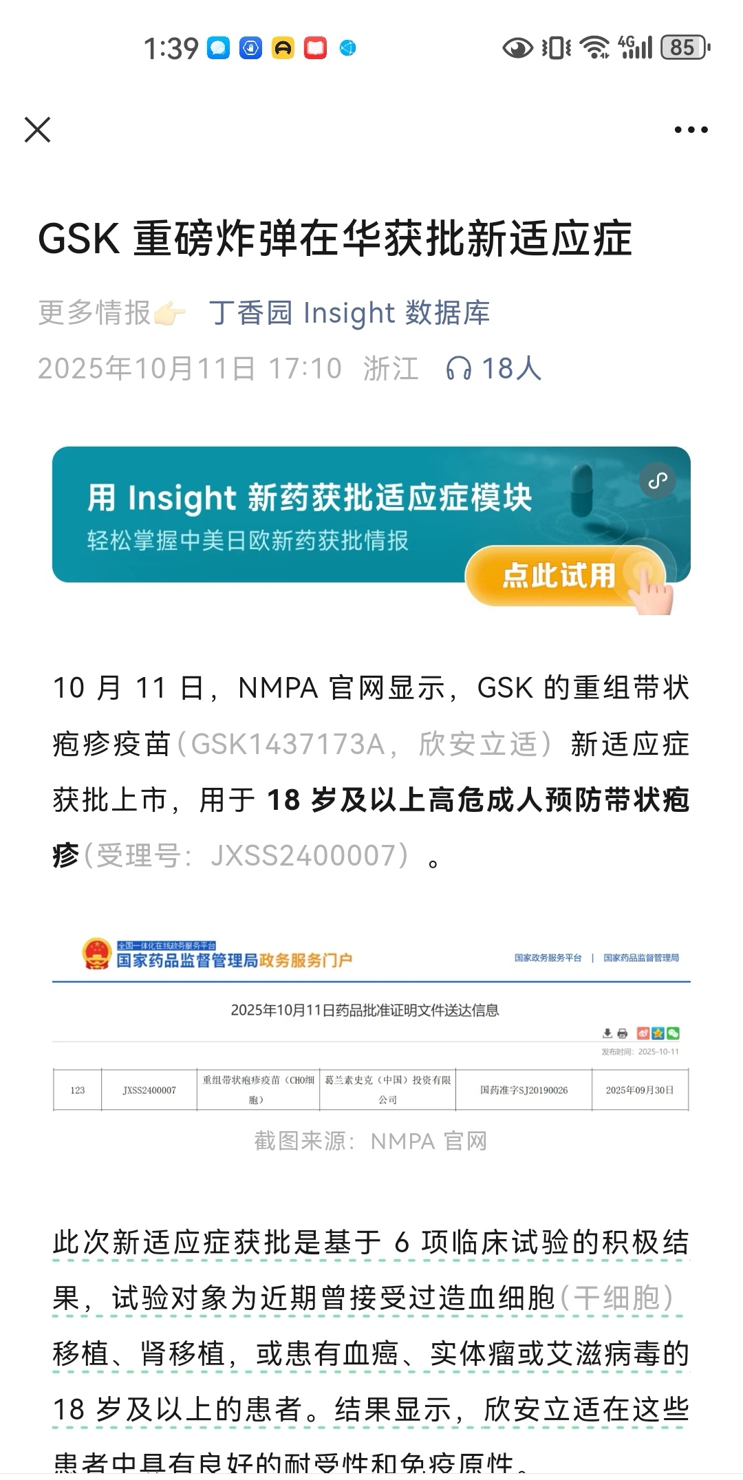 重组带状疱疹疫苗(GSK1437173A,欣安立适)新适应症获批上市,由原来50