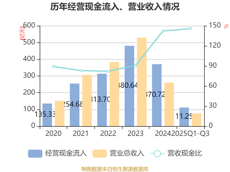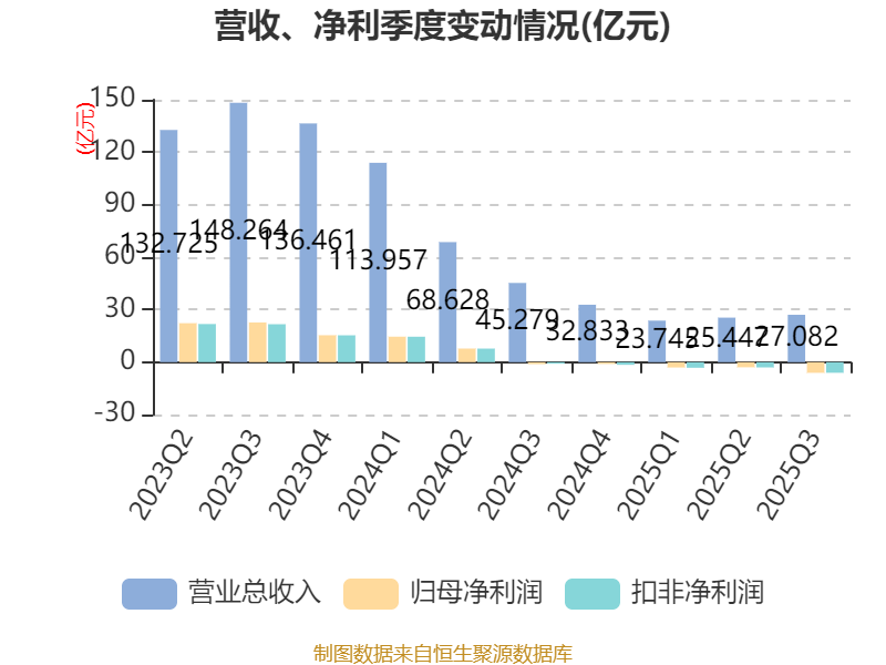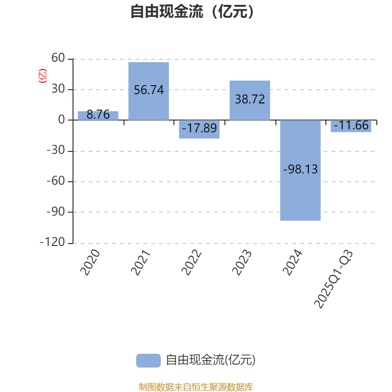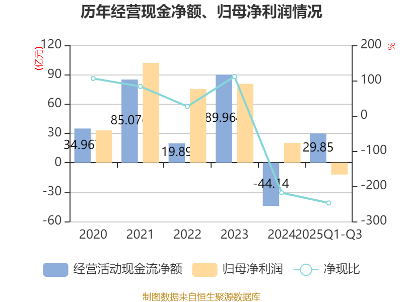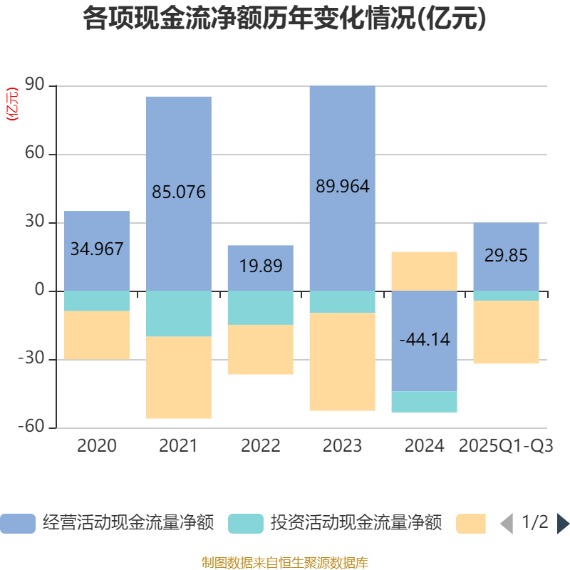 2025年前三季度,公司经营活动现金流净额为29.85亿元,同比增加59.35亿元;筹资活动现金流净额-27.54亿元,同比减少34.95亿元;投资活动现金流净额-4.4亿元,上年同期为-8.7亿元。
