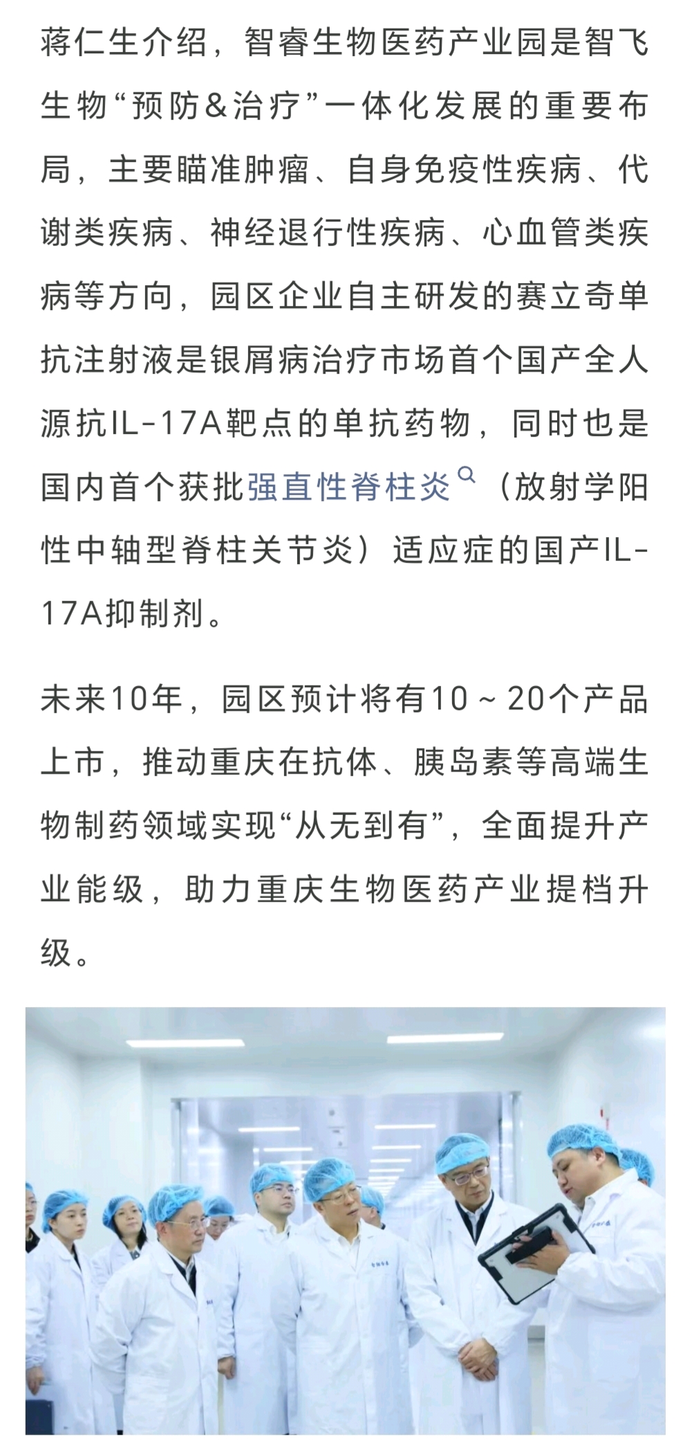 面对未来,企业发展的磅礴动力离不开前瞻政策的支持。就在前几天,重庆市政府正式发布了《重庆市全链条支持创新药高质量发展若干措施》,推出了覆盖研发、临床、产业化、入院支付等环节的25条硬核措施。政策明确,对获批上市的每个创新药将给予1000万元的重奖,并致力于将临床试验启动周期缩短至25周以内,以“创新药应用清单”机制确保优质产品“应配尽配”快速入院。这一系列举措,无疑为如智飞生物这样与民族复兴伟业同呼吸共命运的企业注入了最强大的驱动力,让企业能够更加专注地为了梦想和使命负重前行,在为全民构建全生命周期健康防护网的征程中再创辉煌荣光。