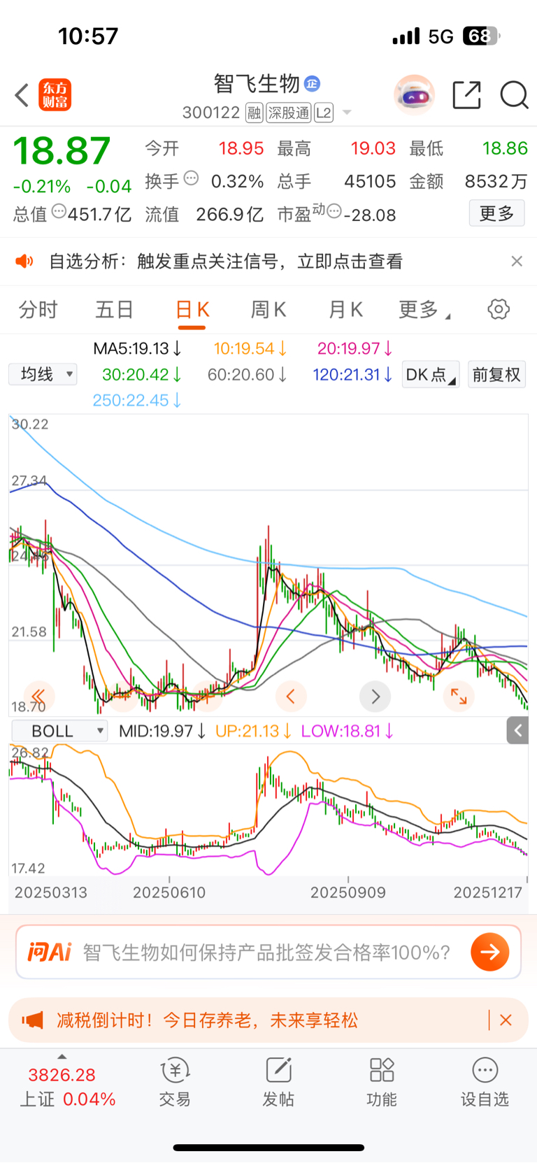 $智飞生物(SZ300122)$ 妥妥的温水煮青蛙看似一天跌的不多、拉长时间看吓一跳、以前还觉得哪有只跌不涨的股、这回是真服了、问题是大盘还是在3900附近、不敢想象大盘回到3600智飞是什状态、扛不住了、老智飞了奉劝各位兄弟没有买的千万不要觉得便宜就买、浅套的能跑就跑、投资有风险、投资智飞大大的风险